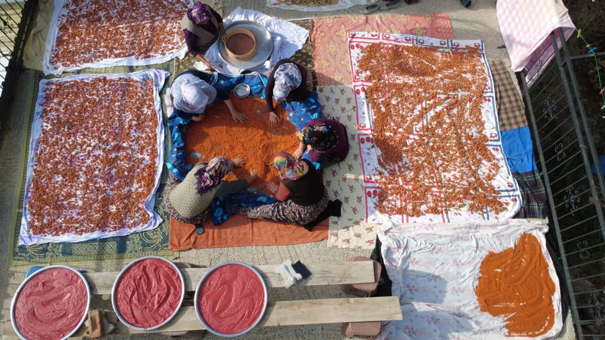 Manisa'nın Demirci ilçesinde, soğuk havalarda tüketilmek üzere, günler süren çalışmayla 16 çeşit malzemeden tarhana yapılıyor.