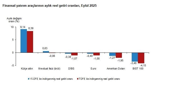 Türkiye İstatistik Kurumu (TÜİK), Eylül 2025 dönemine ilişkin finansal yatırım araçlarının reel getiri oranlarını açıkladı. Buna göre; aylık en yüksek reel getiri, yurt içi üretici fiyat endeksi (Yİ-ÜFE) ile indirgendiğinde yüzde 9,14, tüketici fiyat endeksi (TÜFE) ile indirgendiğinde ise yüzde 8,39 oranlarıyla külçe altında gerçekleşti.