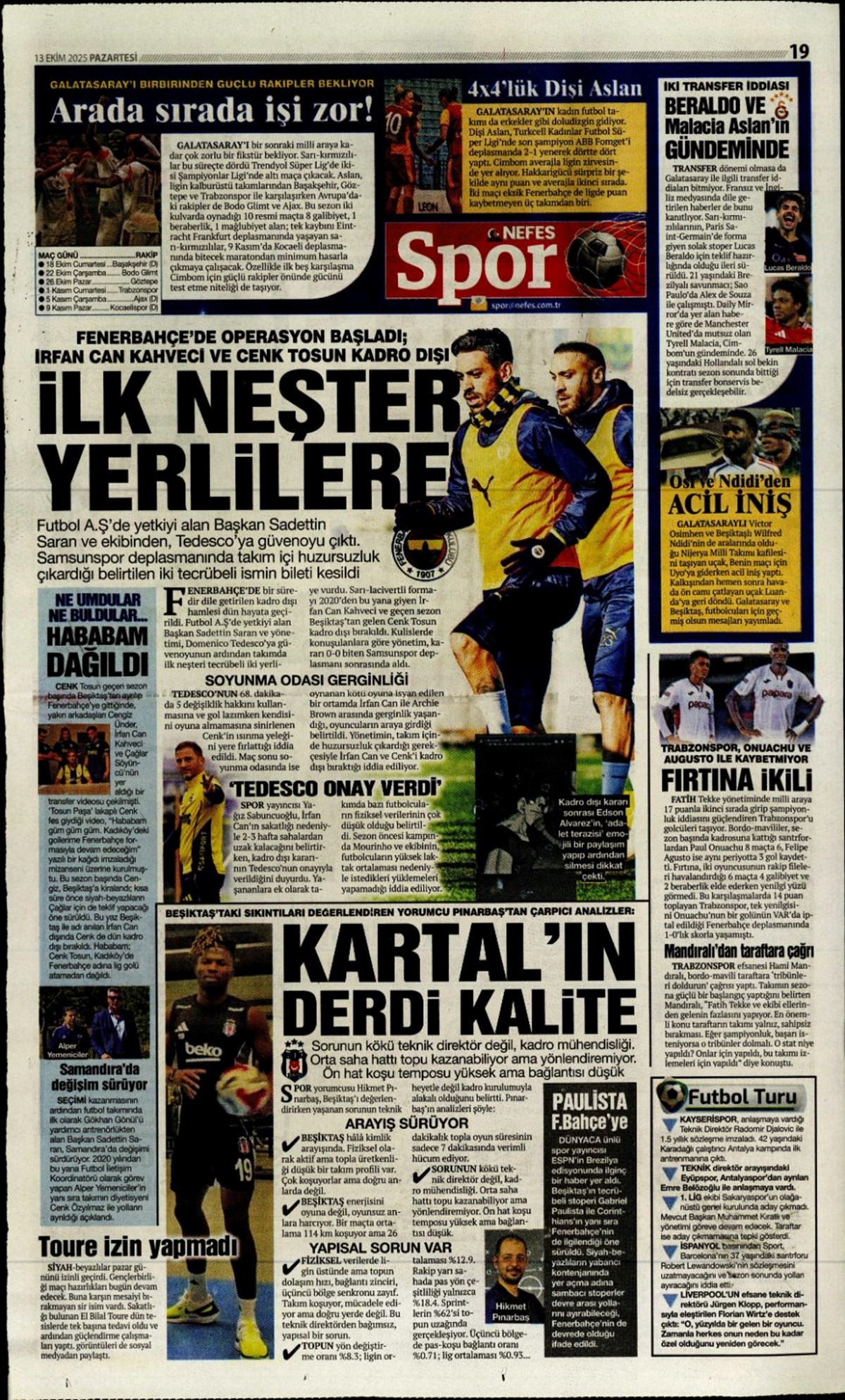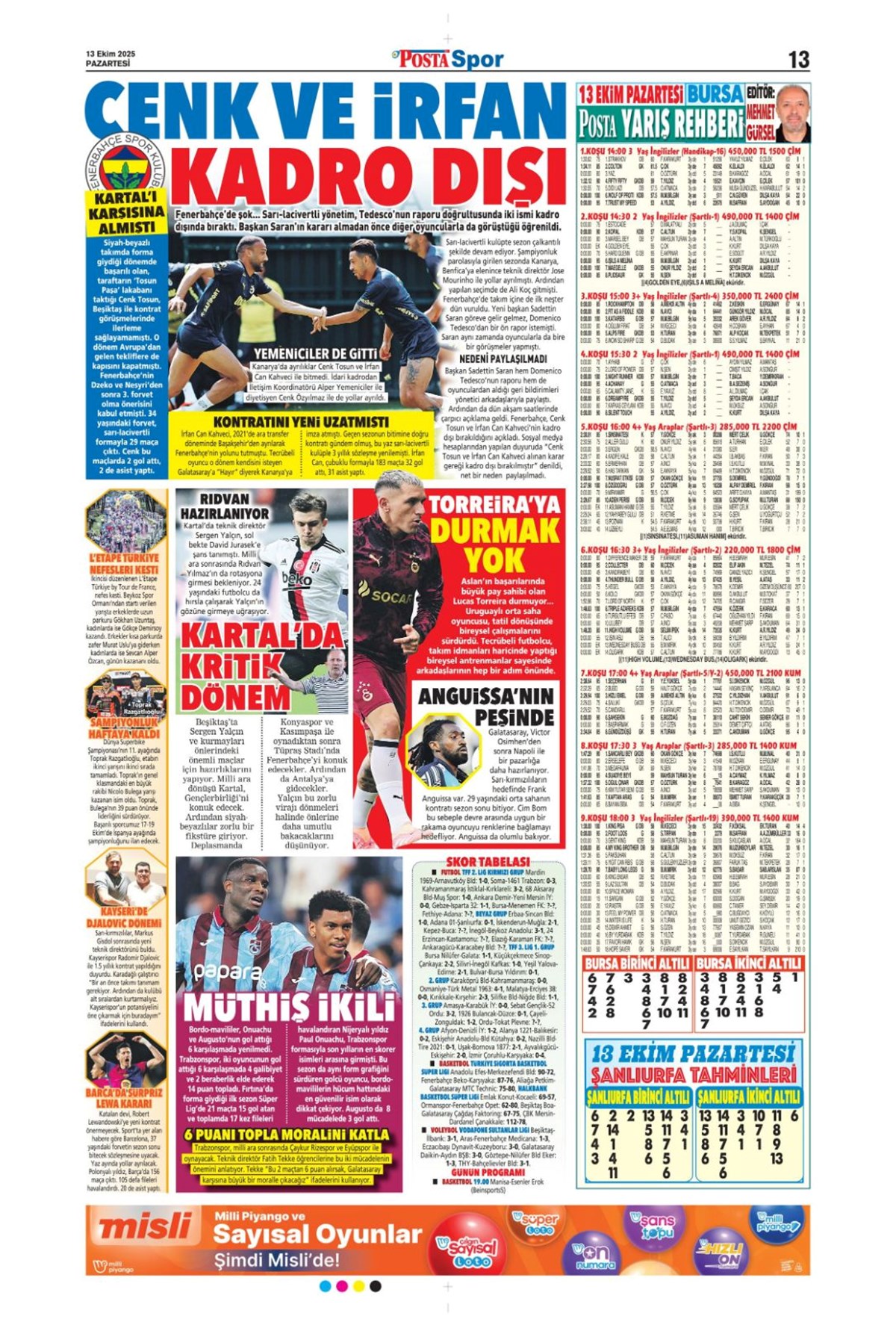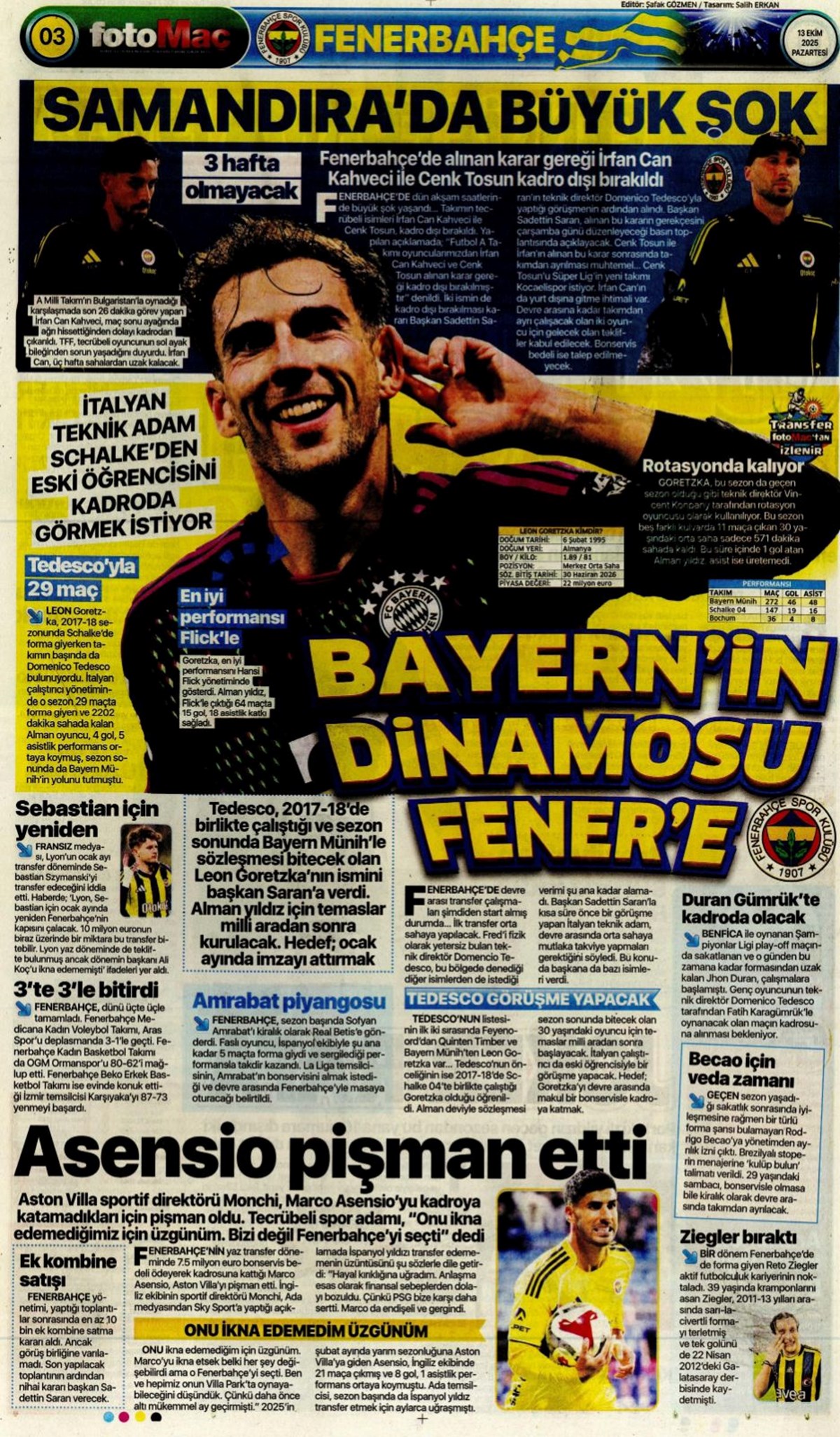 "Bayern'in dinamosu Fener'e..." (13 Ekim 2025 spor manşetleri)