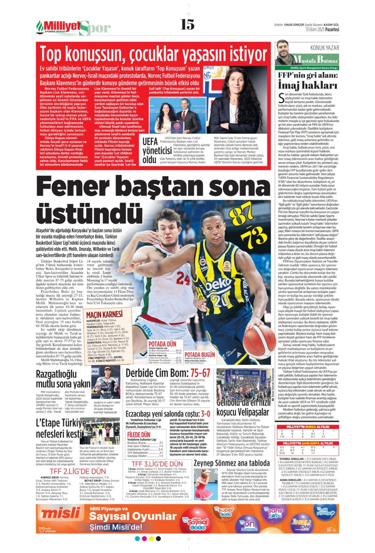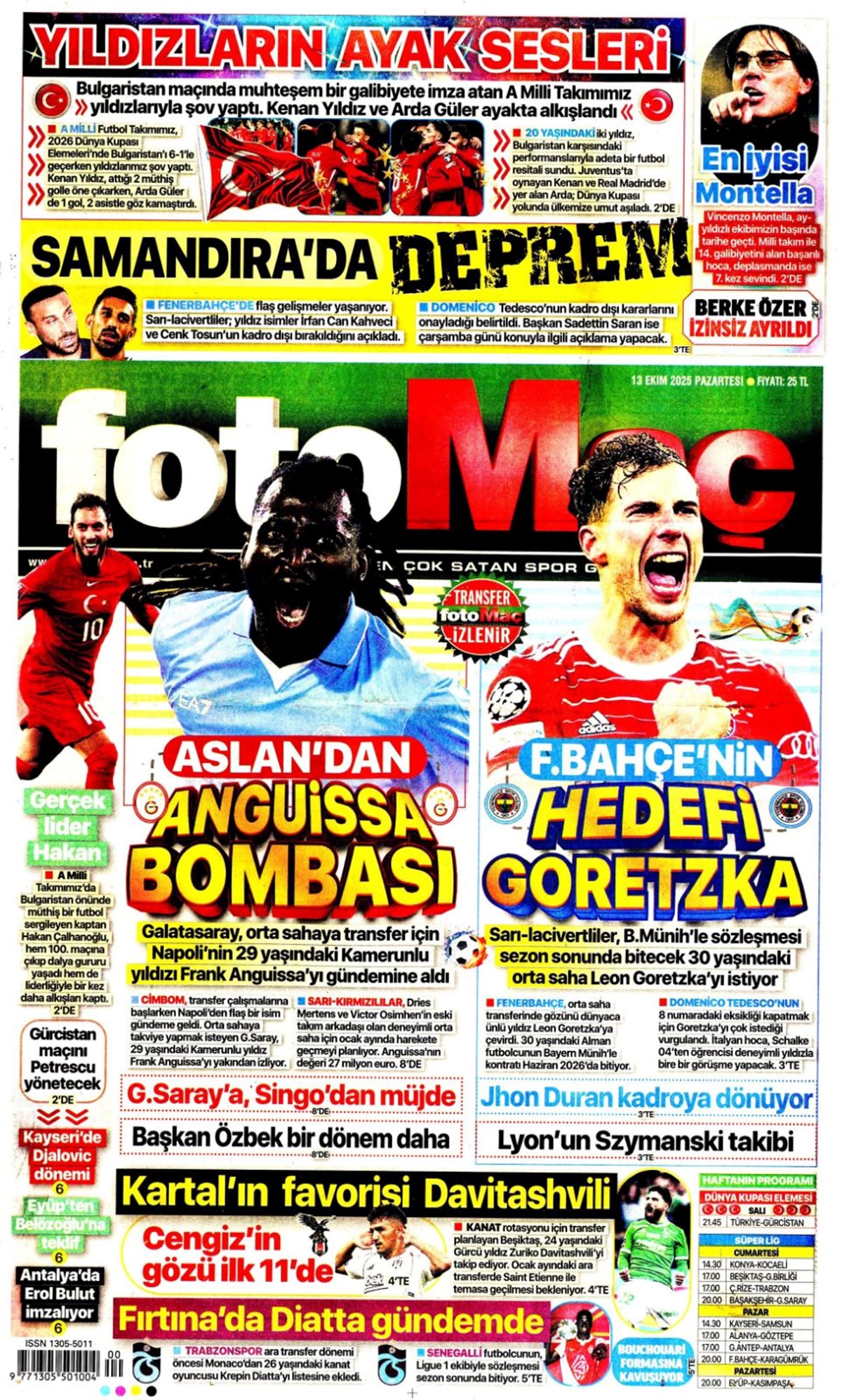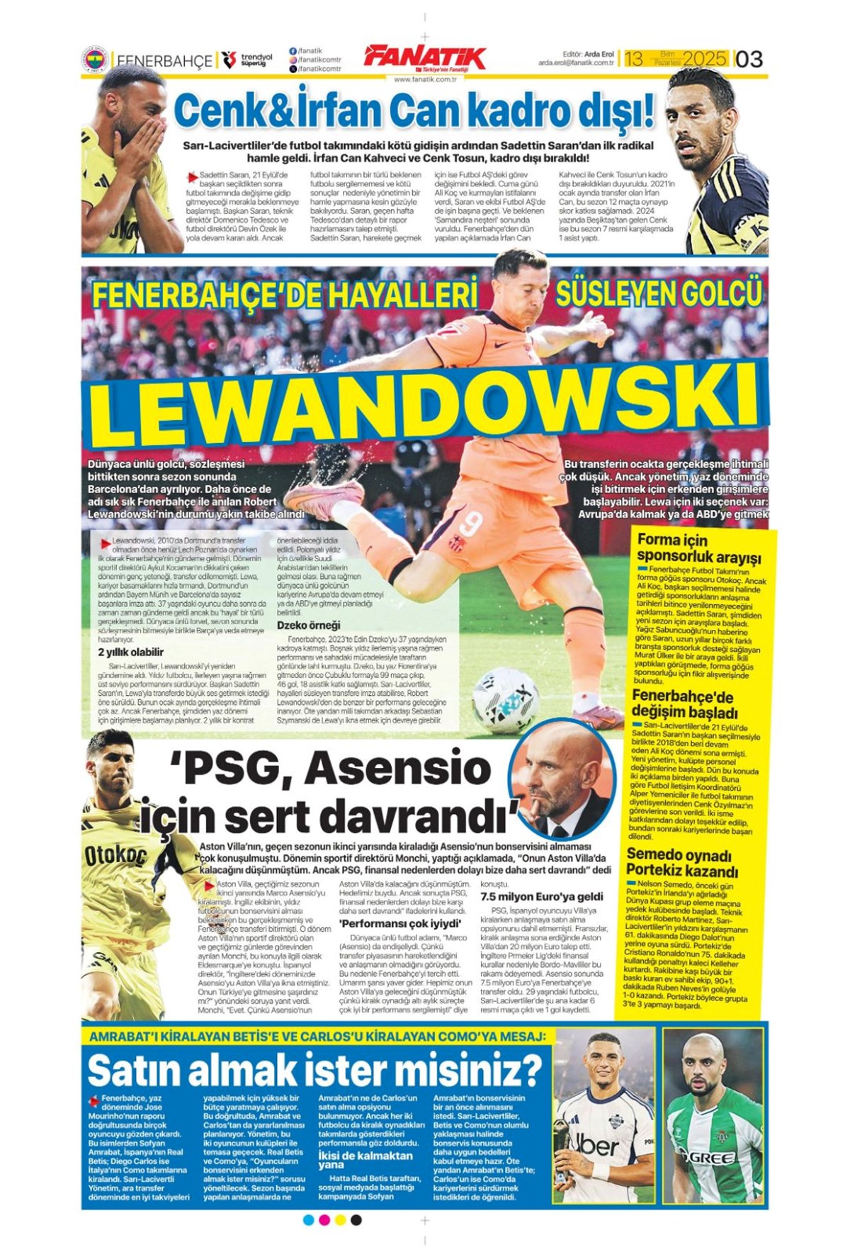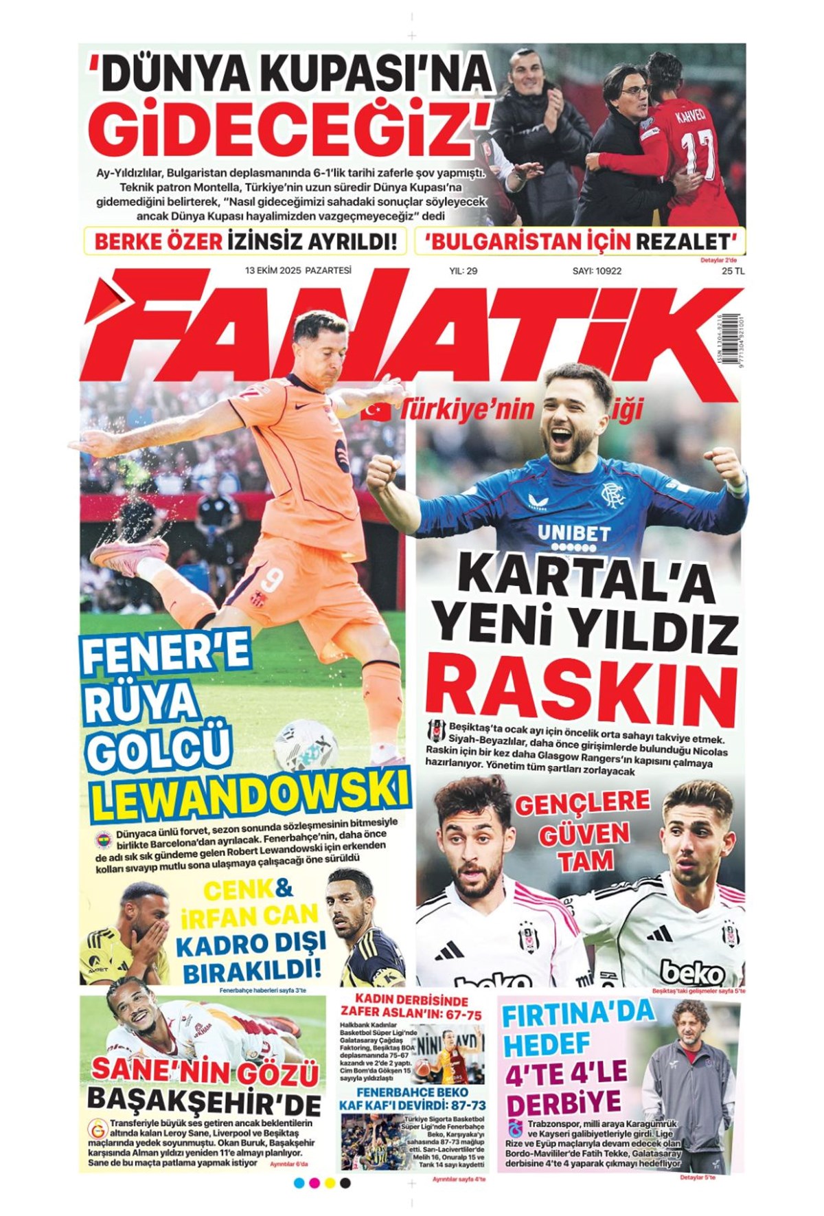 "Bayern'in dinamosu Fener'e..." (13 Ekim 2025 spor manşetleri)