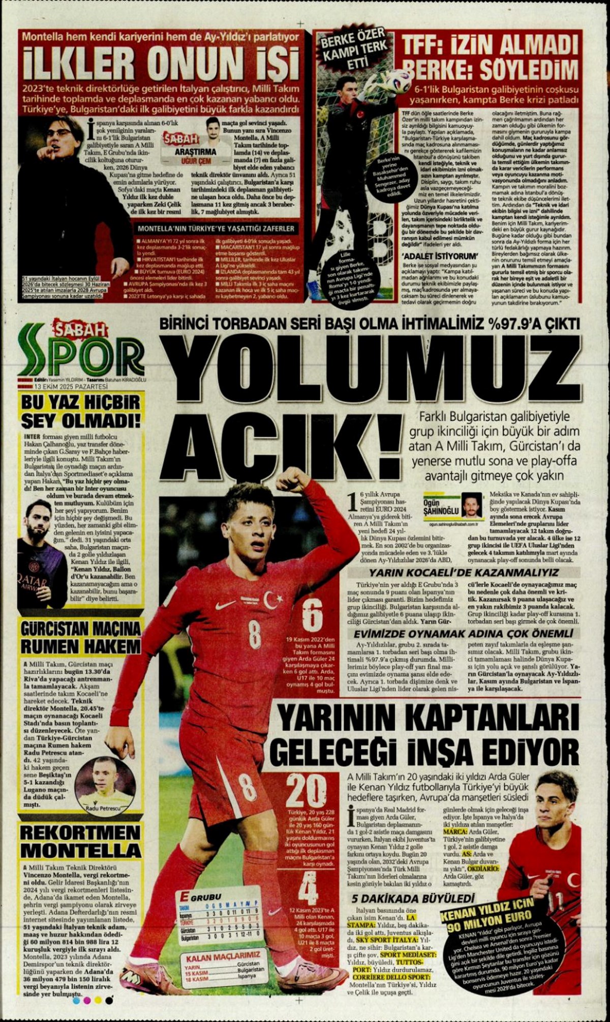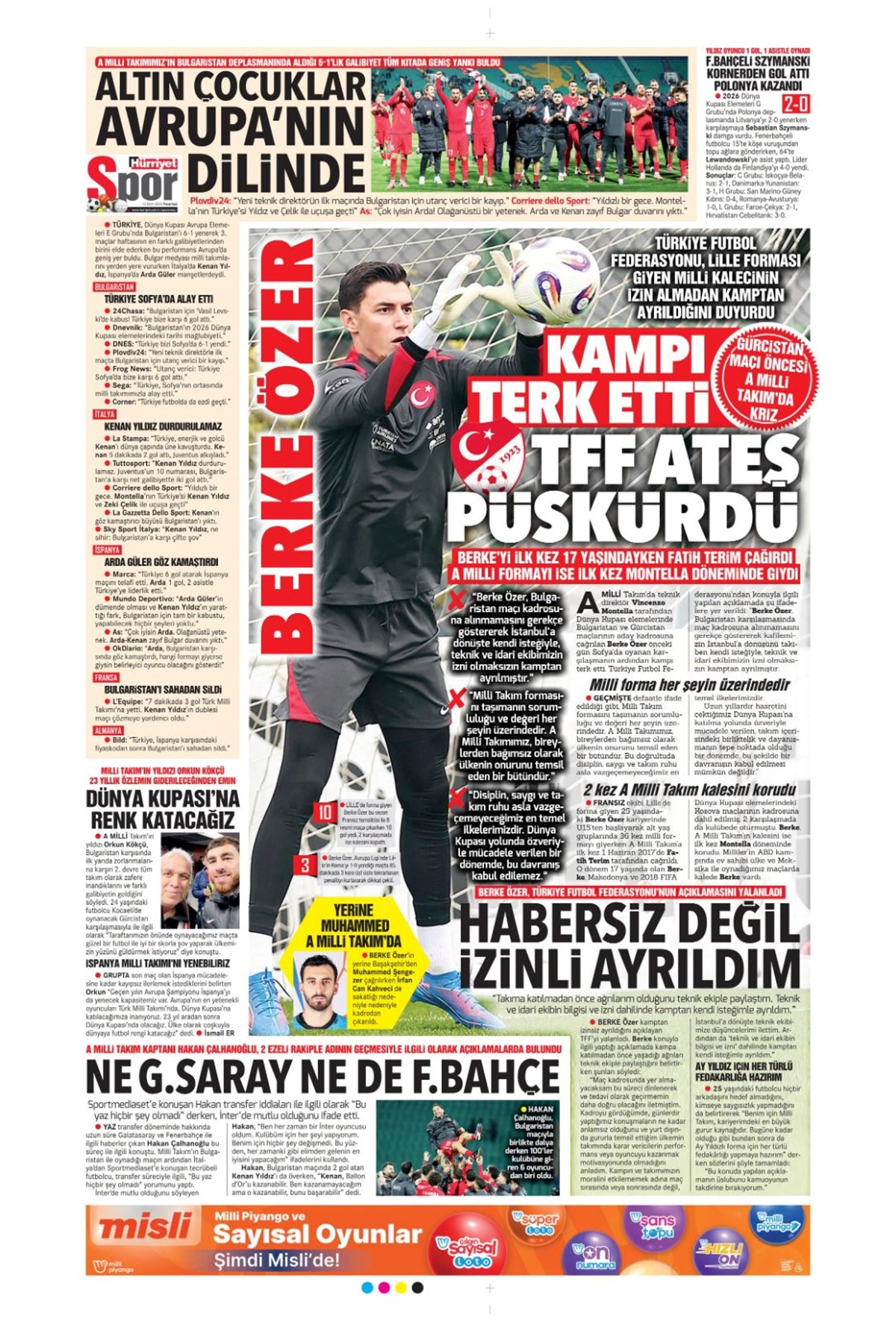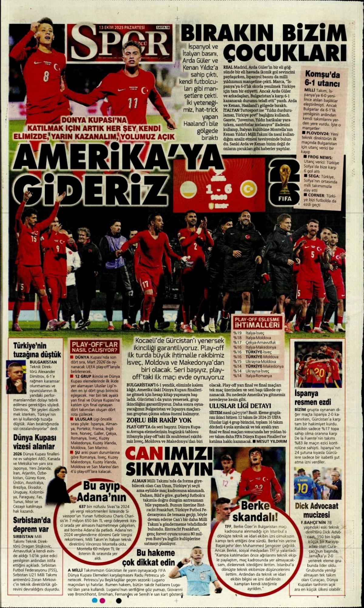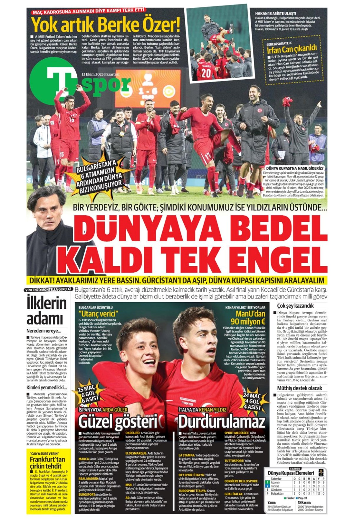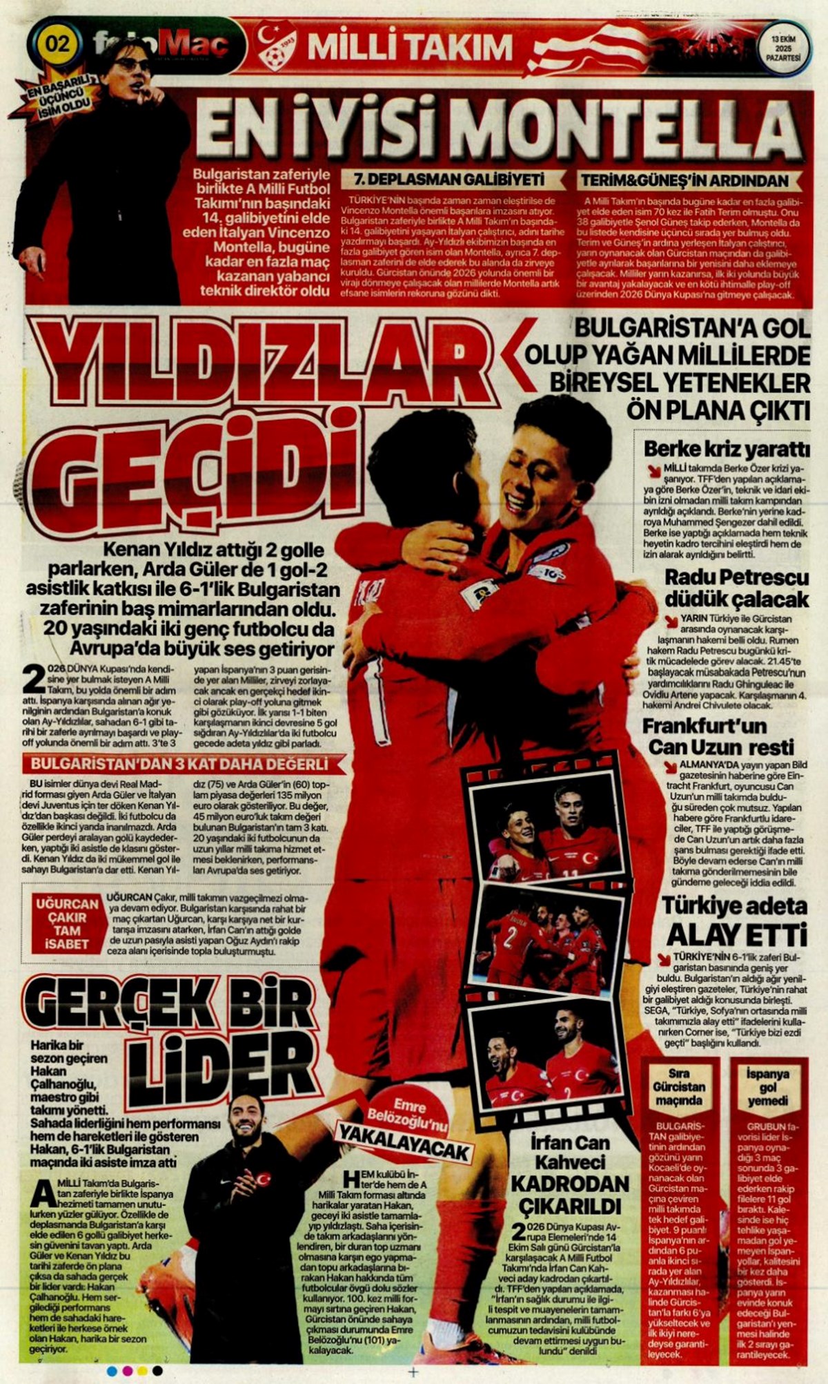 Günün spor manşetlerinde, spor gündeminden en yeni gelişmeler ve transfer haberleri yer aldı. 13 Ekim 2025 tarihli gazetelerin spor sayfalarında 2026 Dünya Kupası elemelerinde Bulgaristan karşısına çıkacak A Milli Takım, Beşiktaş, Fenerbahçe, Galatasaray ve Trabzonspor haberlerine, 1 dakikada göz atın.