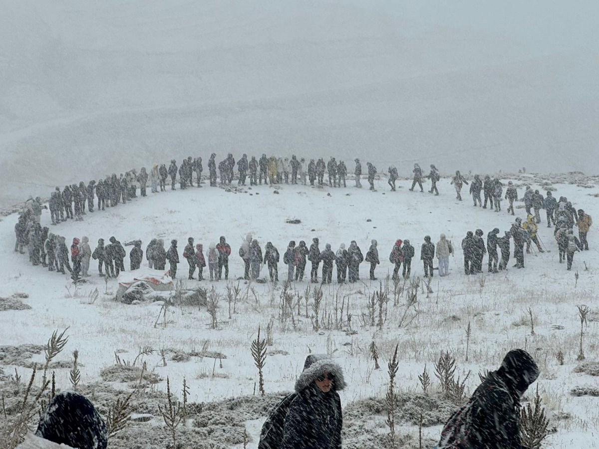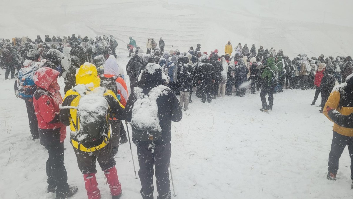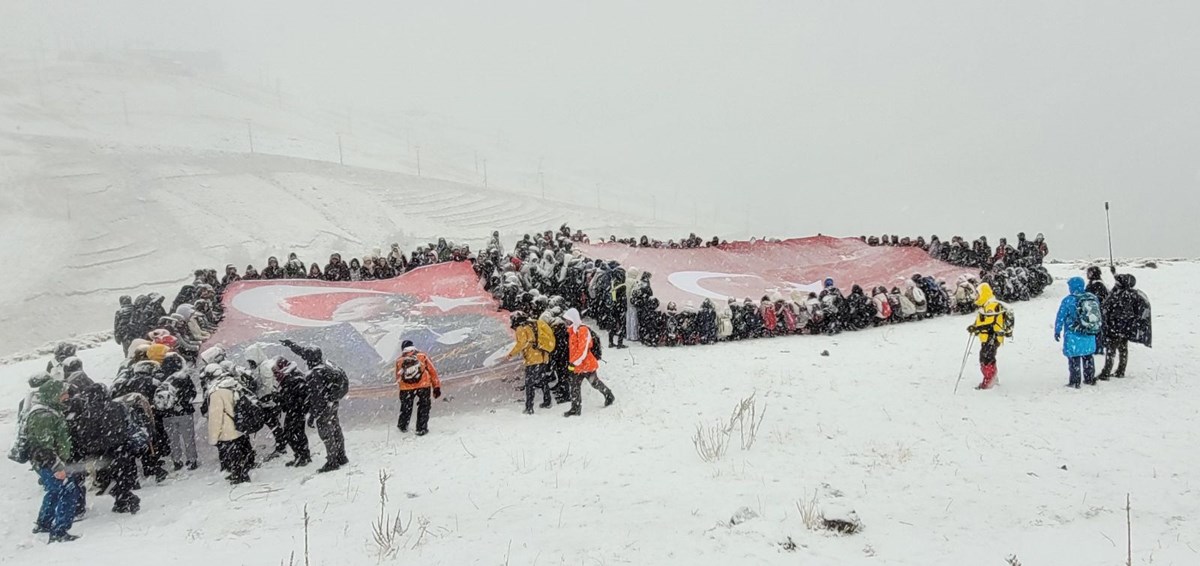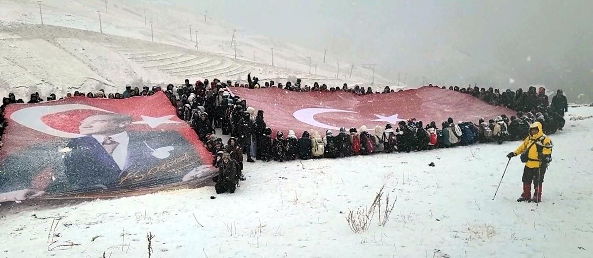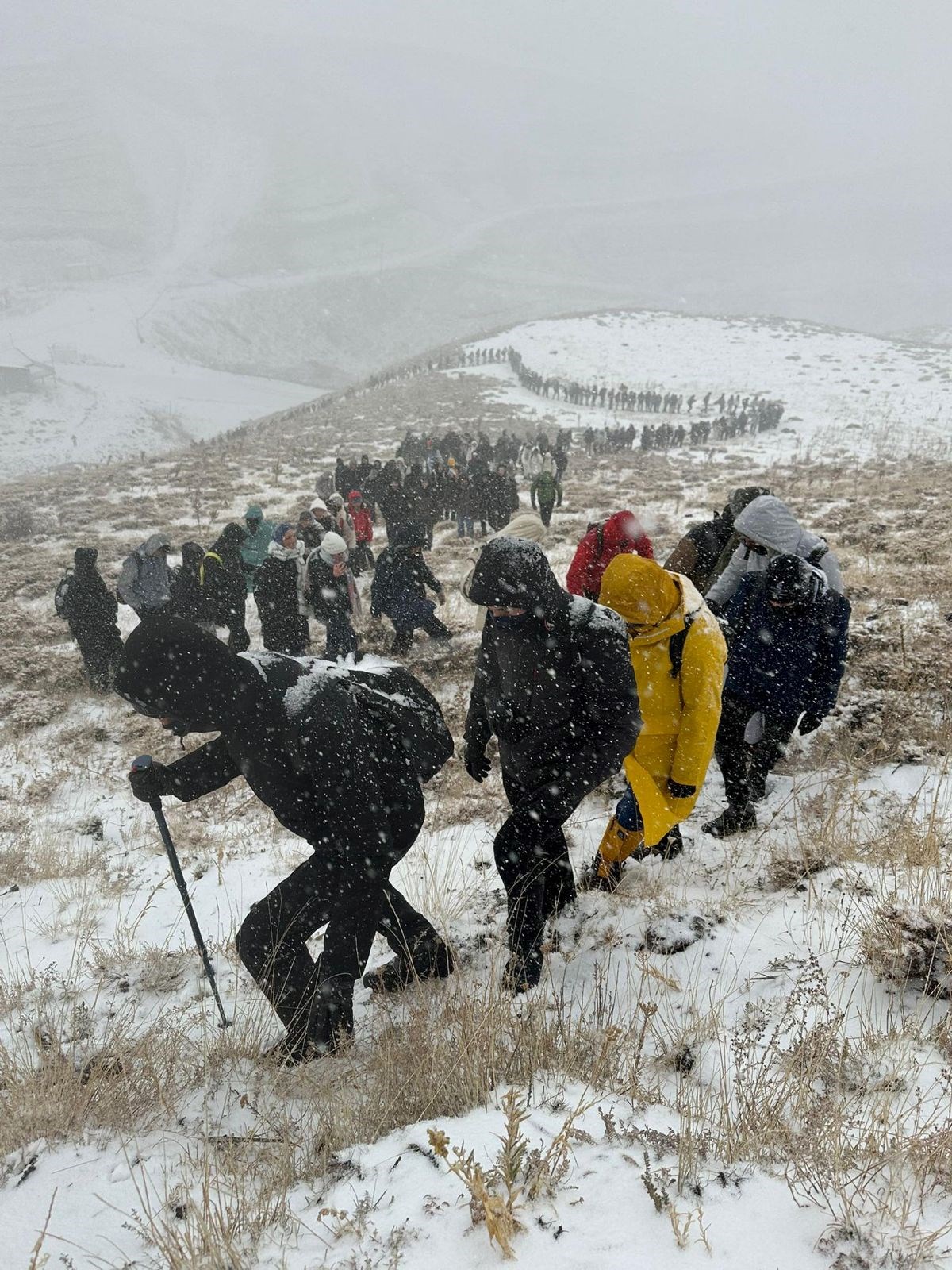 Kapalı havada, tek sıra yürüyen grup, bir süre sonra tipiye yakalandı.Olumsuz hava şartları nedeniyle Alaattin Karaca, zirve tırmanışını iptal etti.Katılımcılar, 2 bin 700 metre yükseklikte yürüşü sonlandırdı, Atatürk posteri ve Türk bayrağı açtı.Saygı duruşunda bulunup İstiklal Marşı'nı okuyan öğrenciler, daha sonra inişe geçti.