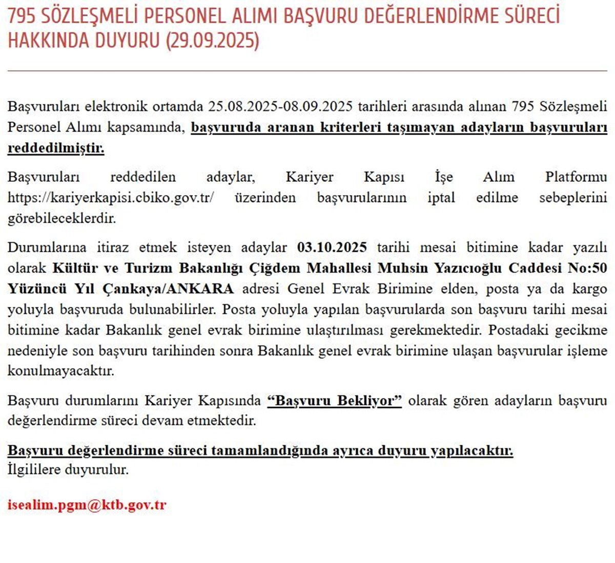 Kültür ve Turizm Bakanlığı; büro personeli, koruma ve güvenlik görevlisi, temizlik personeli, şoför, aşçı, kütüphaneci, tekniker, teknisyen alımı yapacağını duyurmuştu. Kültür ve Turizm Bakanlığı 795 personel alımı başvuruları, 25 Ağustos'ta başladı. Adaylar işlemlerini 8 Eylül'e kadar tamamladı.Kültür ve Turizm Bakanlığı 795 personel alımı sonuçları açıklanmış değil. Değerlendirme ve sınav aşamaları dikkate alındığında, sonuçların Ekim sonu ile Kasım başı arasında açıklanması bekleniyor.Bakanlık son olarak 29 Eylül'de "Başvuruda aranan kriterleri taşımayan adayların başvuruları reddedilmiştir." duyurusunu yaparken değerlendirme sürecinin devam ettiğini belirtti.Yayımlanan duyuruda; "Başvuruları elektronik ortamda 25.08.2025-08.09.2025 tarihleri arasında alınan 795 Sözleşmeli Personel Alımı kapsamında, başvuruda aranan kriterleri taşımayan adayların başvuruları reddedilmiştir.Başvuruları reddedilen adaylar, Kariyer Kapısı İşe Alım Platformu https://kariyerkapisi.cbiko.gov.tr/ üzerinden başvurularının iptal edilme sebeplerini görebileceklerdir.Durumlarına itiraz etmek isteyen adaylar 03.10.2025 tarihi mesai bitimine kadar yazılı olarak Kültür ve Turizm Bakanlığı Çiğdem Mahallesi Muhsin Yazıcıoğlu Caddesi No:50 Yüzüncü Yıl Çankaya/ANKARA adresi Genel Evrak Birimine elden, posta ya da kargo yoluyla başvuruda bulunabilirler. Posta yoluyla yapılan başvurularda son başvuru tarihi mesai bitimine kadar Bakanlık genel evrak birimine ulaştırılması gerekmektedir. Postadaki gecikme nedeniyle son başvuru tarihinden sonra Bakanlık genel evrak birimine ulaşan başvurular işleme konulmayacaktır.Başvuru durumlarını Kariyer Kapısında “Başvuru Bekliyor” olarak gören adayların başvuru değerlendirme süreci devam etmektedir.Başvuru değerlendirme süreci tamamlandığında ayrıca duyuru yapılacaktır.İlgililere duyurulur. " denildi.