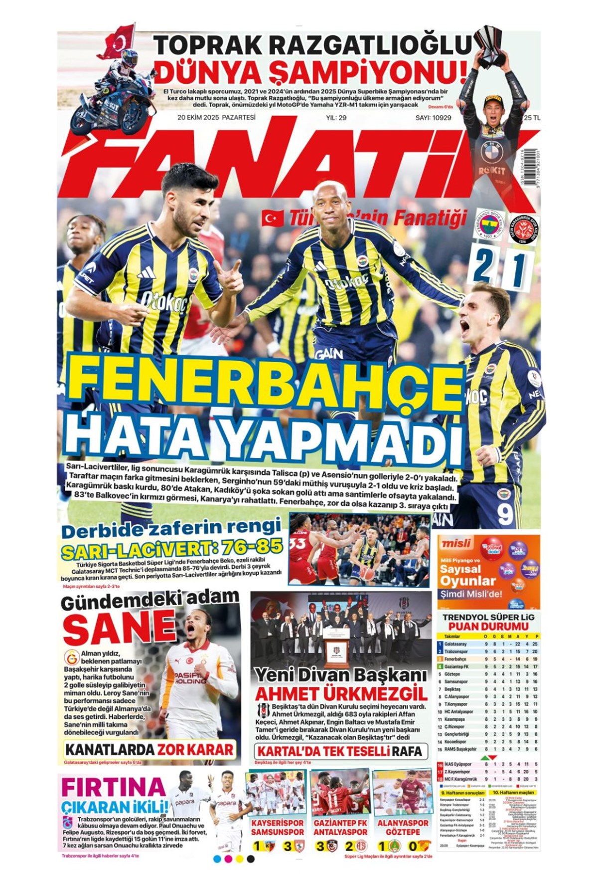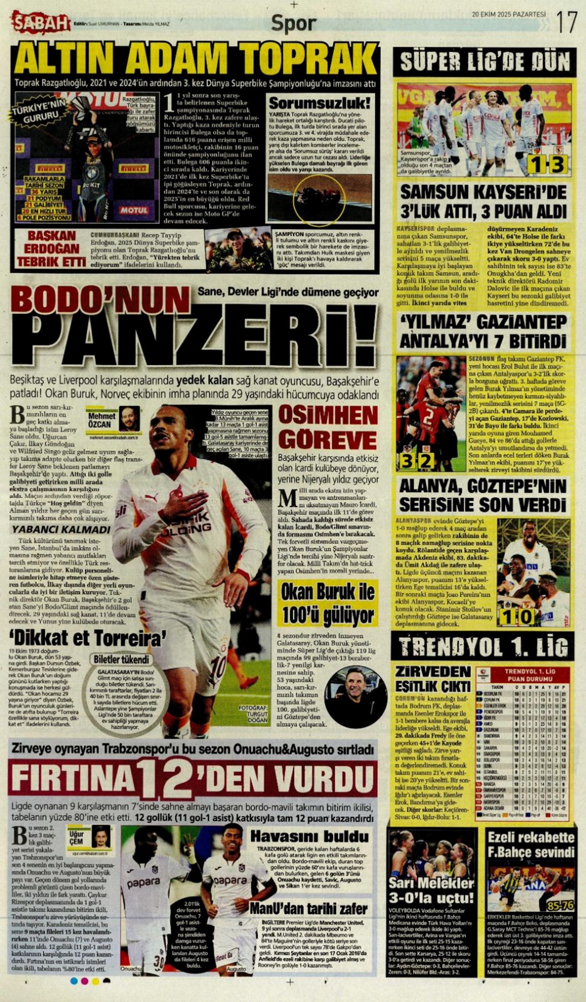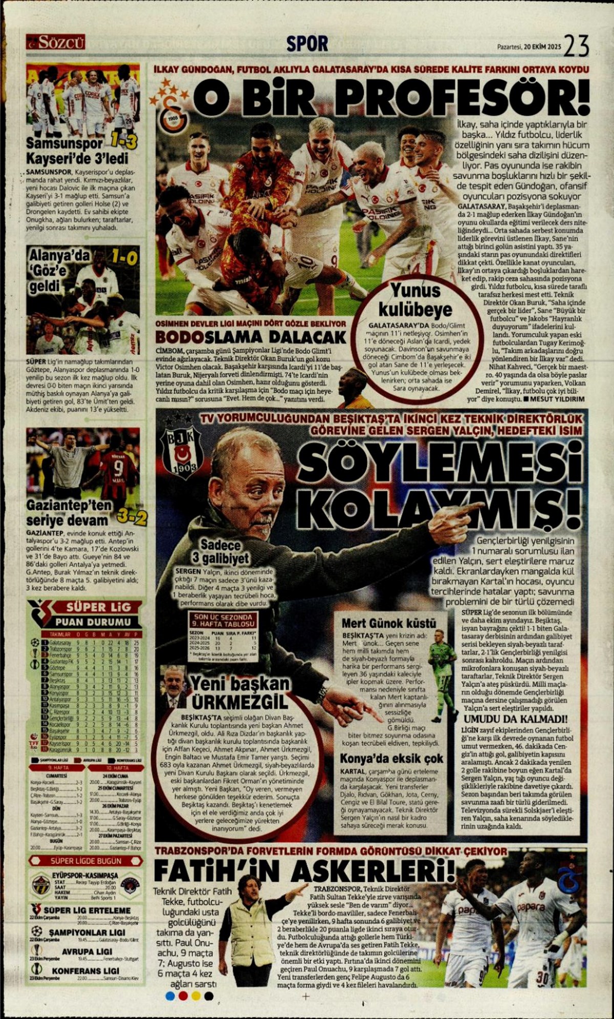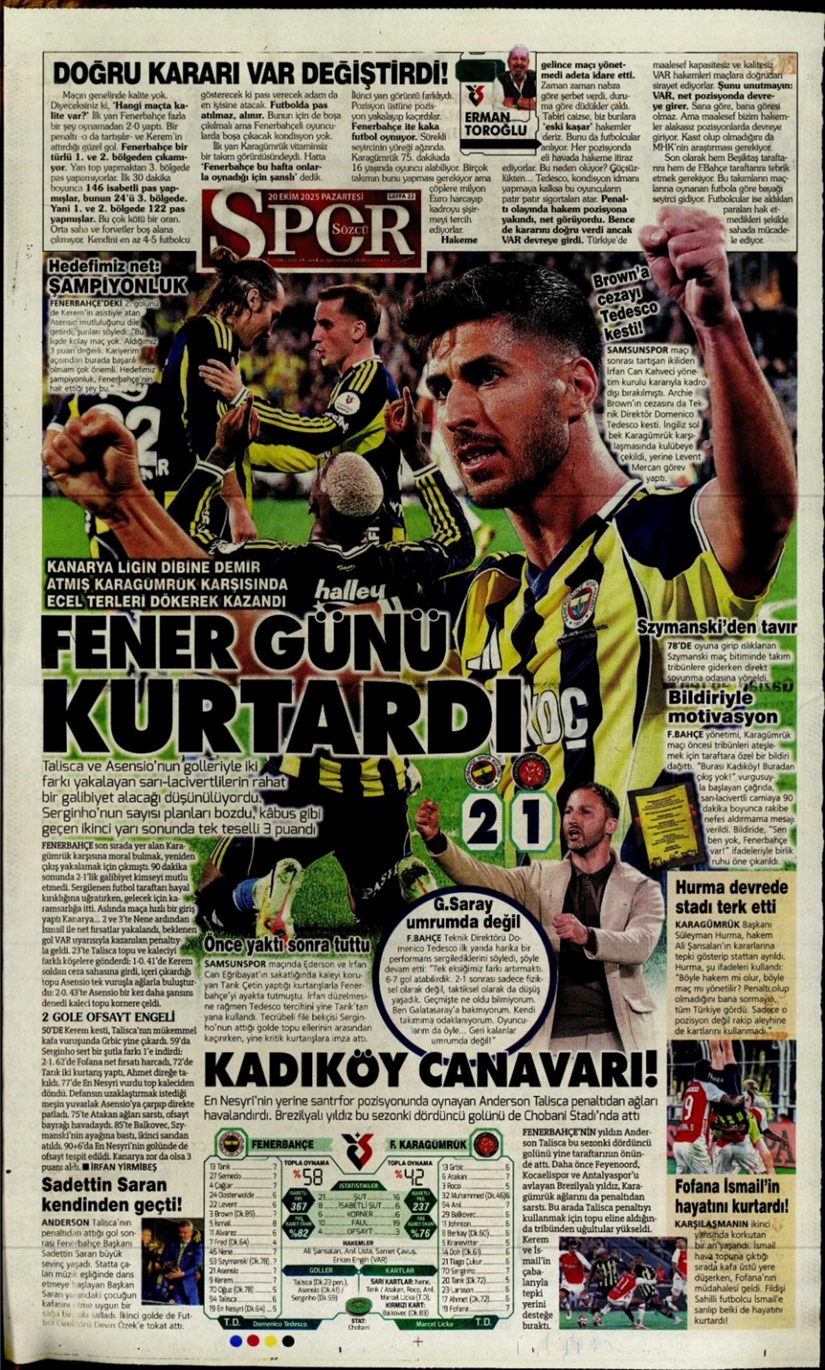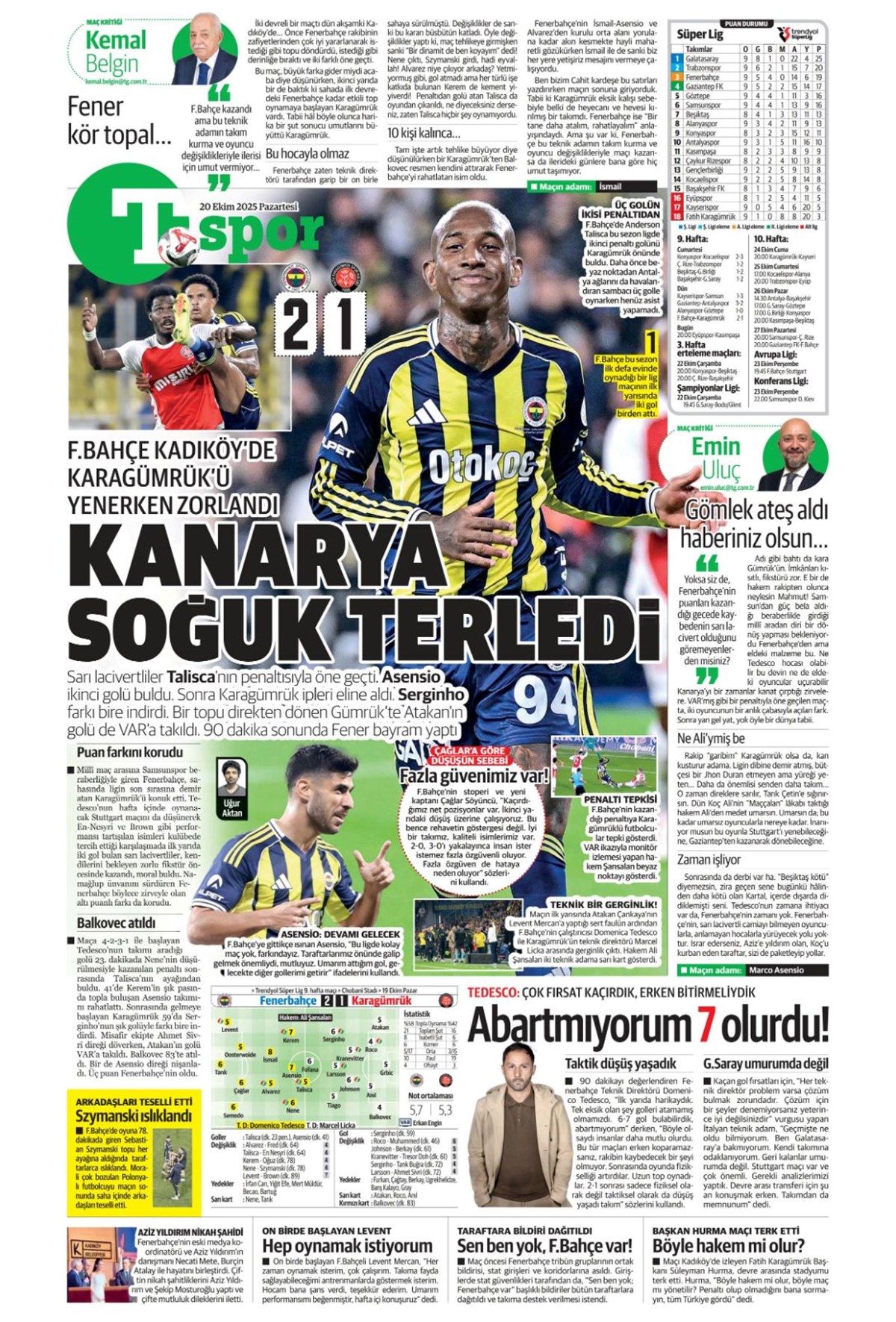"El Turco'nun üçüncü harikası" (20 Ekim 2025 spor manşetleri)