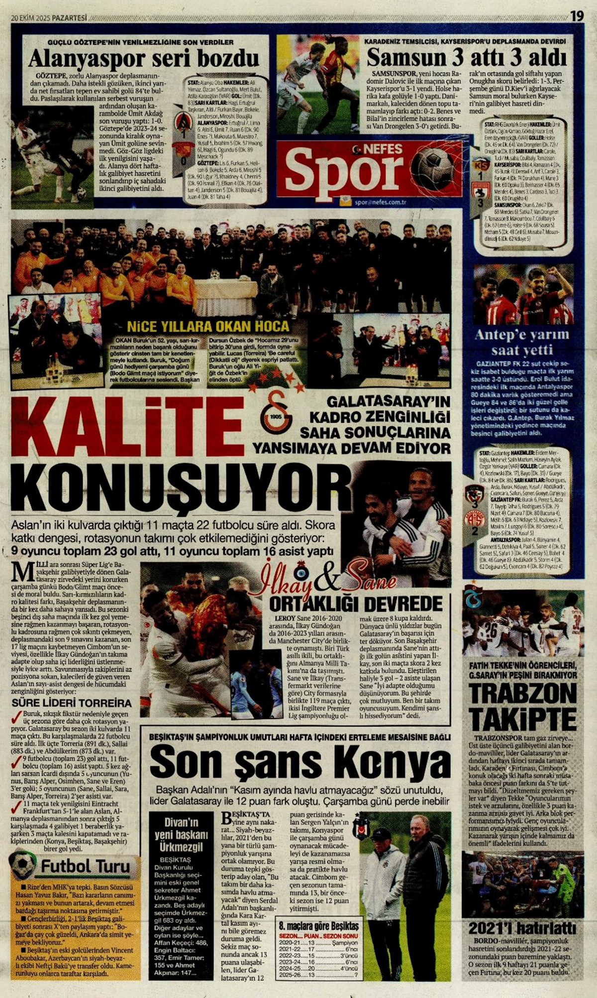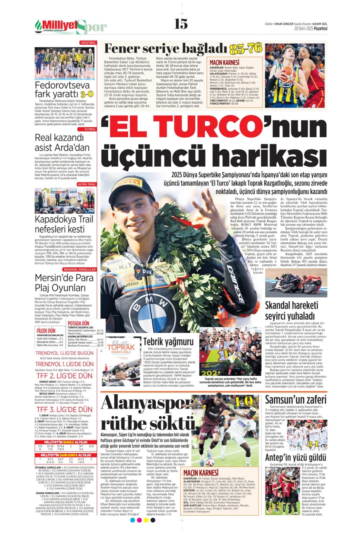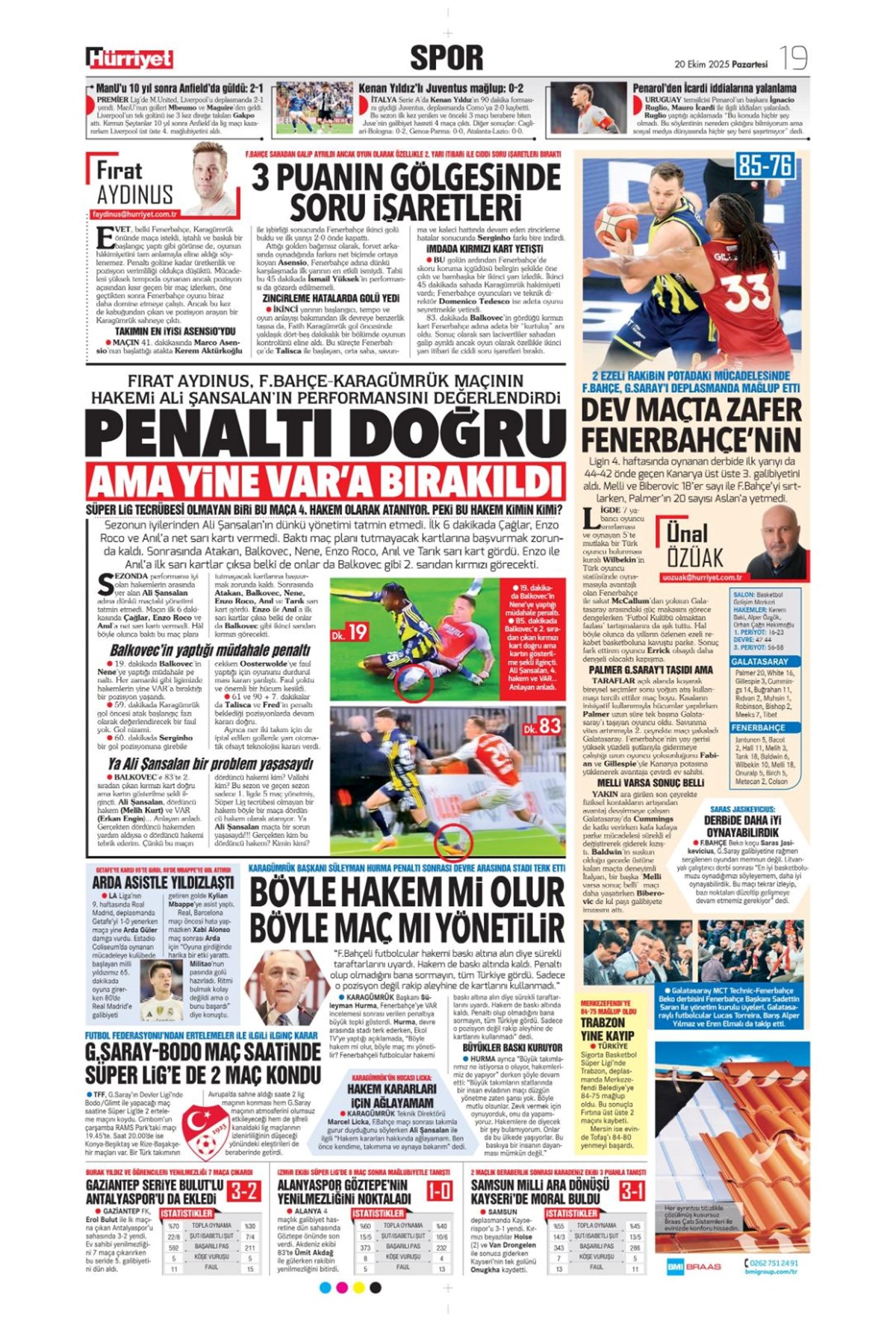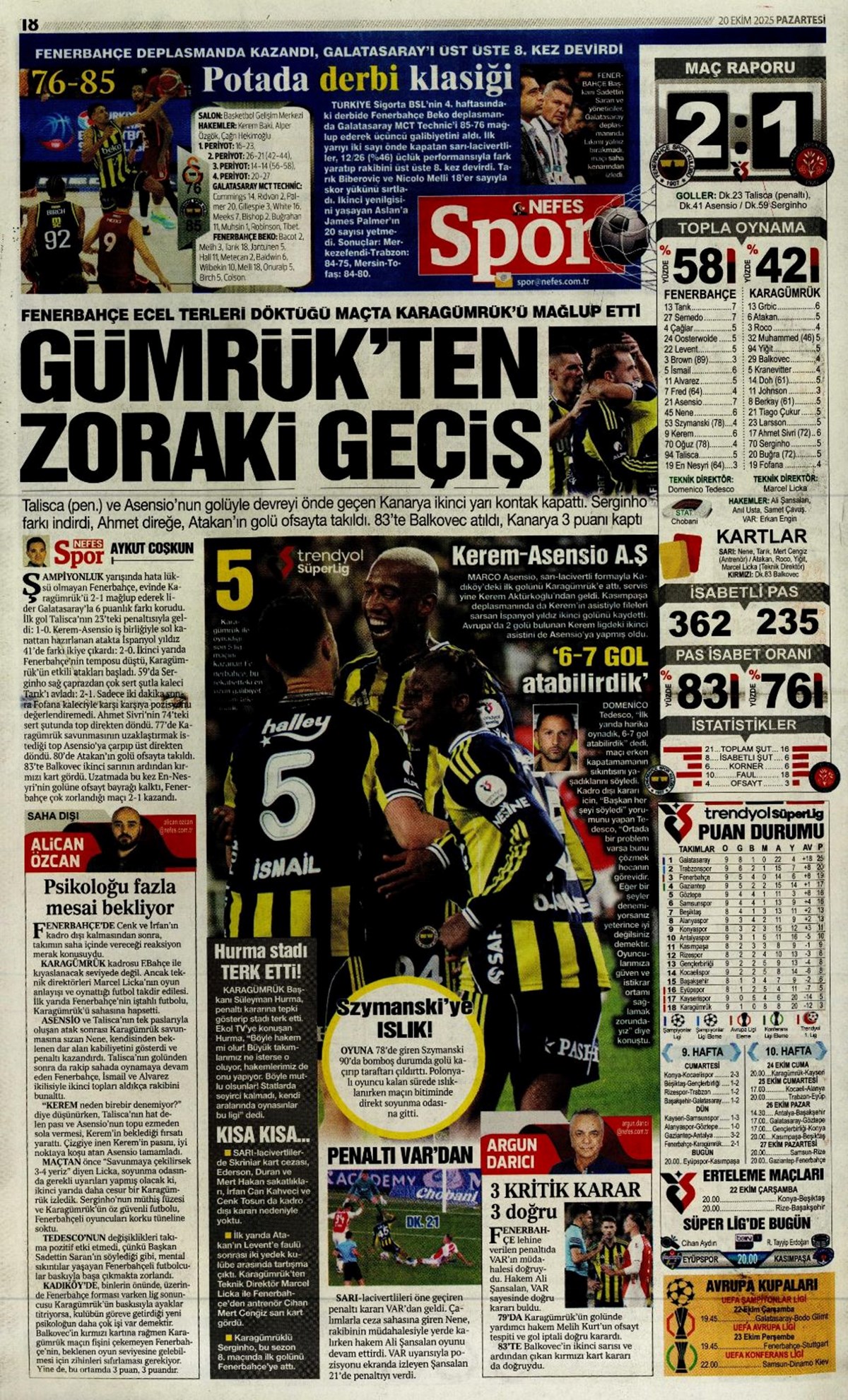 "El Turco'nun üçüncü harikası" (20 Ekim 2025 spor manşetleri)