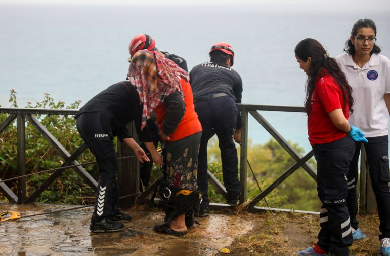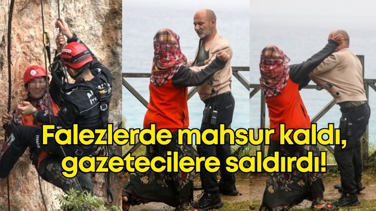 Falezlerde mahsur kalan kadın, gazetecilere saldırdı!