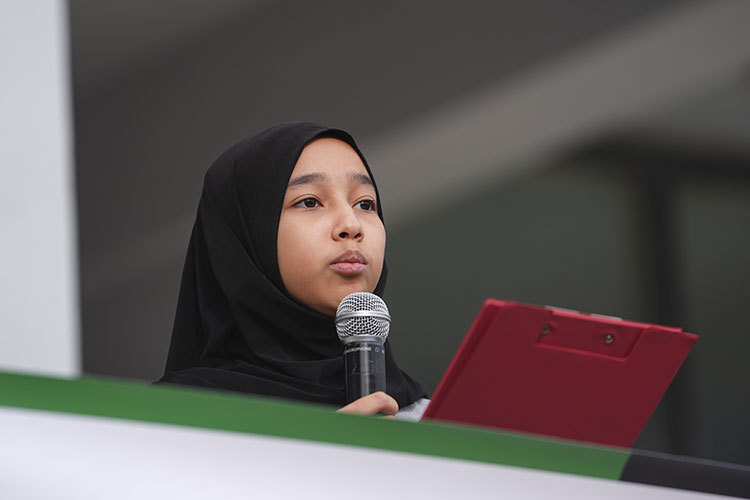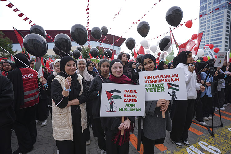 Kur'an-ı Kerim tilavetiyle başlayan etkinlikte, "Ezelden ebede nehirden denize", "Aksa Tufanı diriltiyor insanı", "Şehadet bir çağrıdır nesillere, çağlara", "Filistin’de çocukların öldürülmesine dur de", "Sabır, savaş, zafer adım Müslüman", "Direnişin adı Gazze" ve “Bir çocuk ölür bin Ubeyde doğar” yazılı dövizler taşıyan öğrenciler, Gazze'de şehit olan çocukların isimlerinin yazılı olduğu balonları gökyüzüne bıraktı.