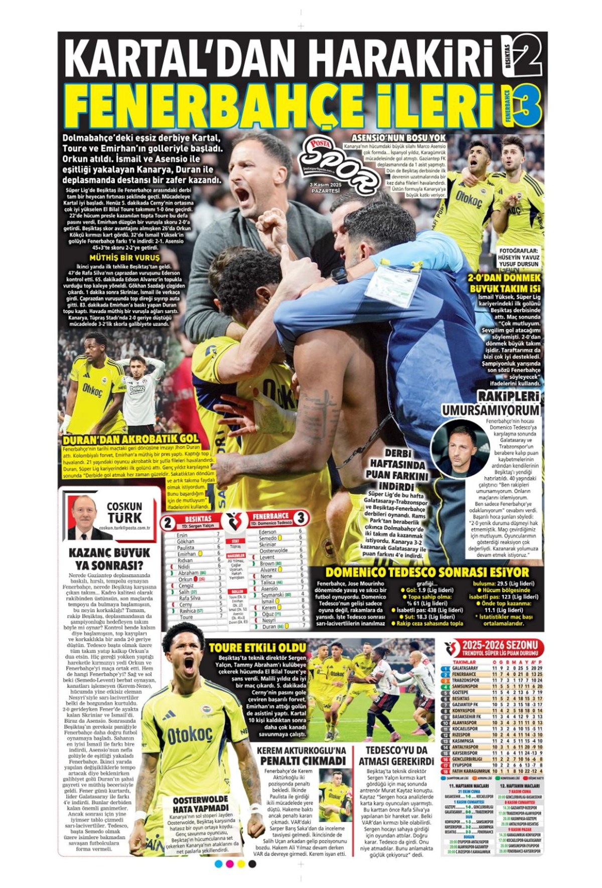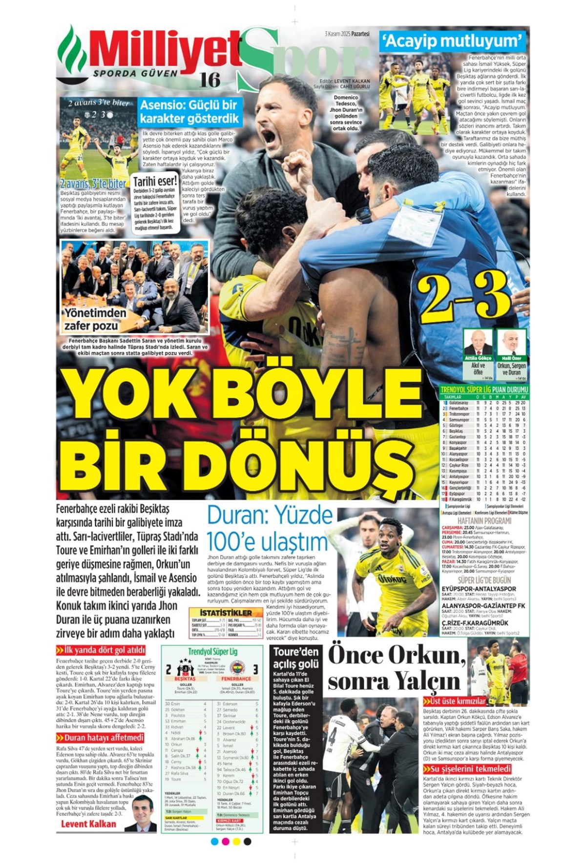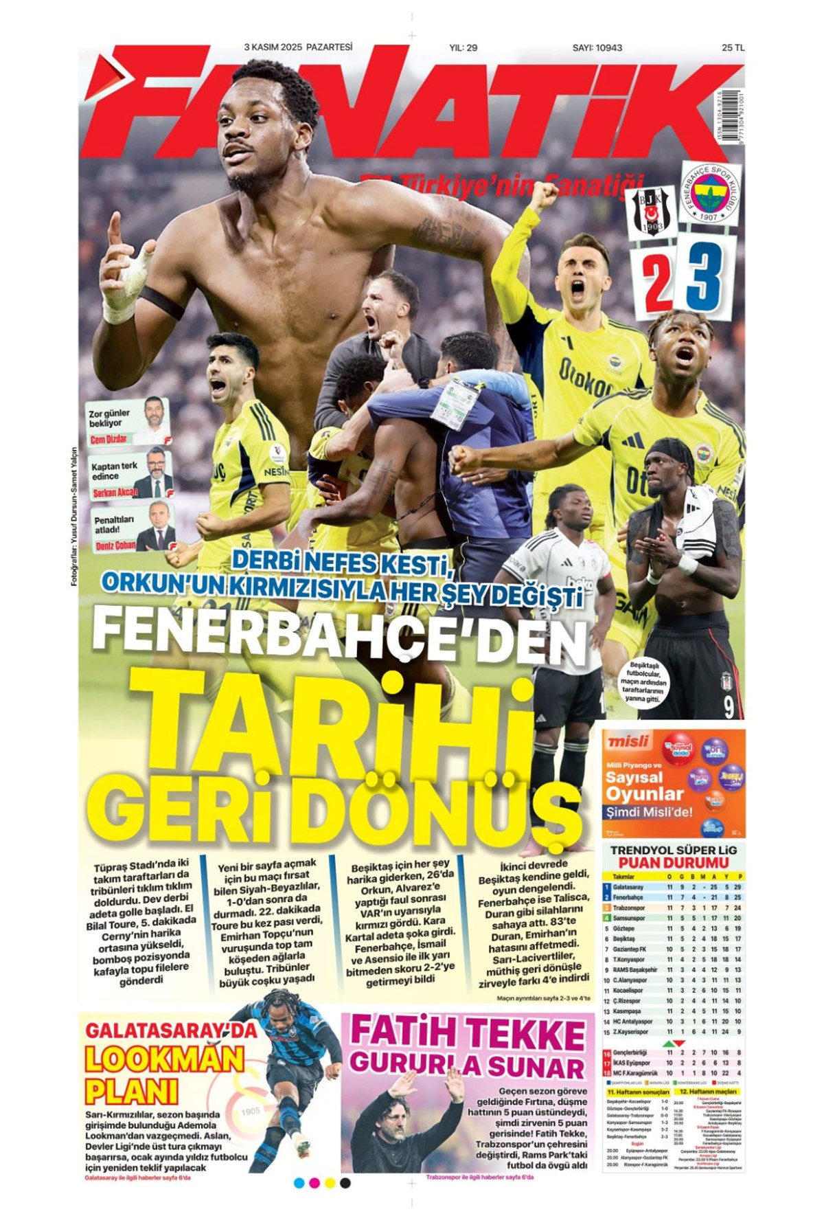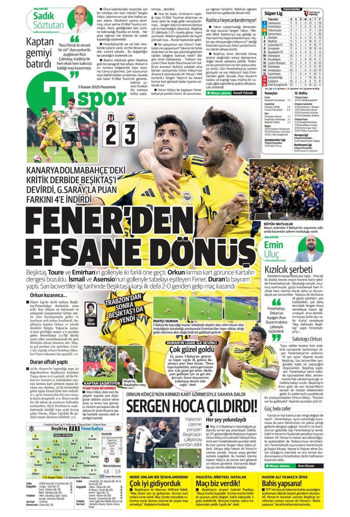 "Kırmızı derbi" (3 Kasım 2025 spor manşetleri)