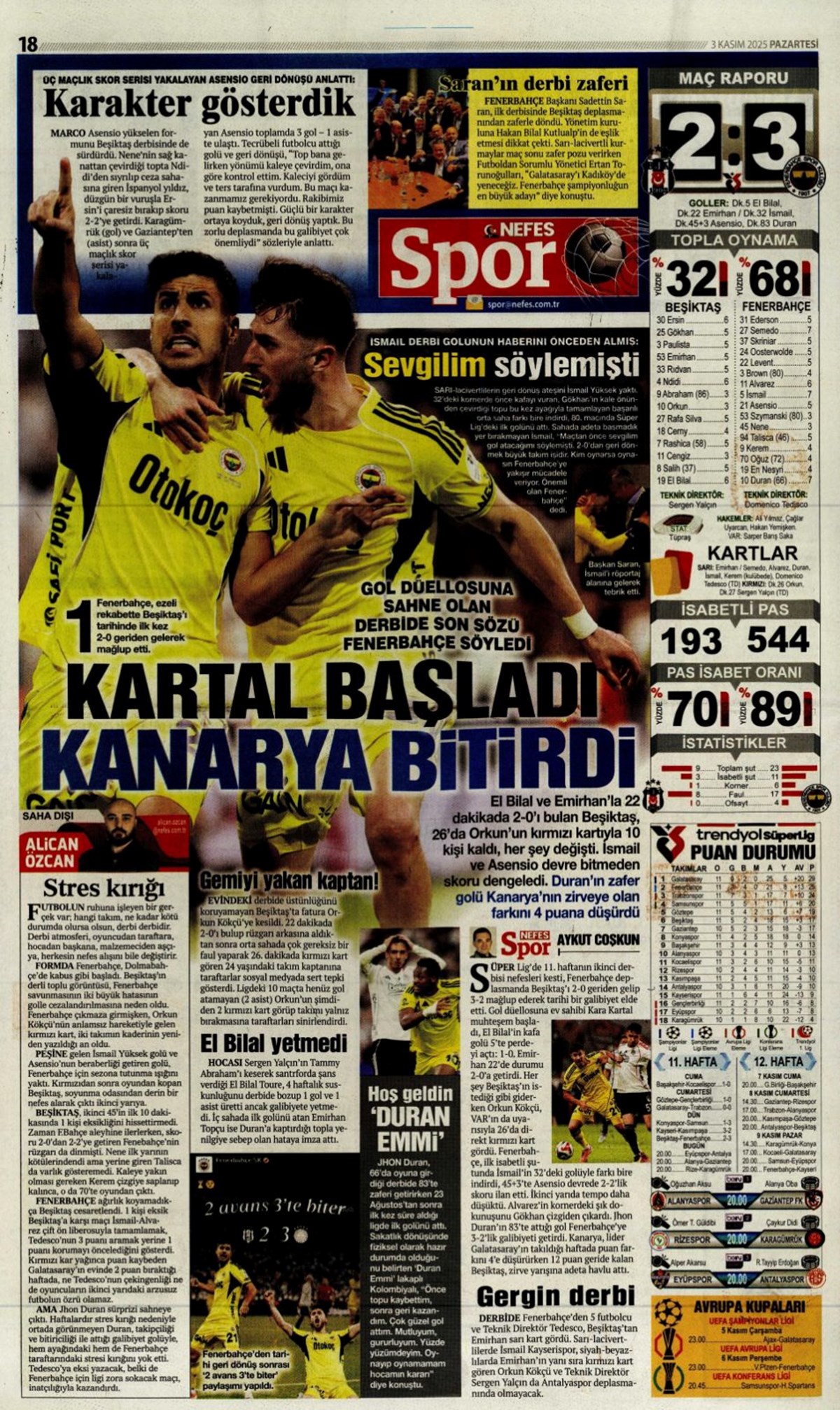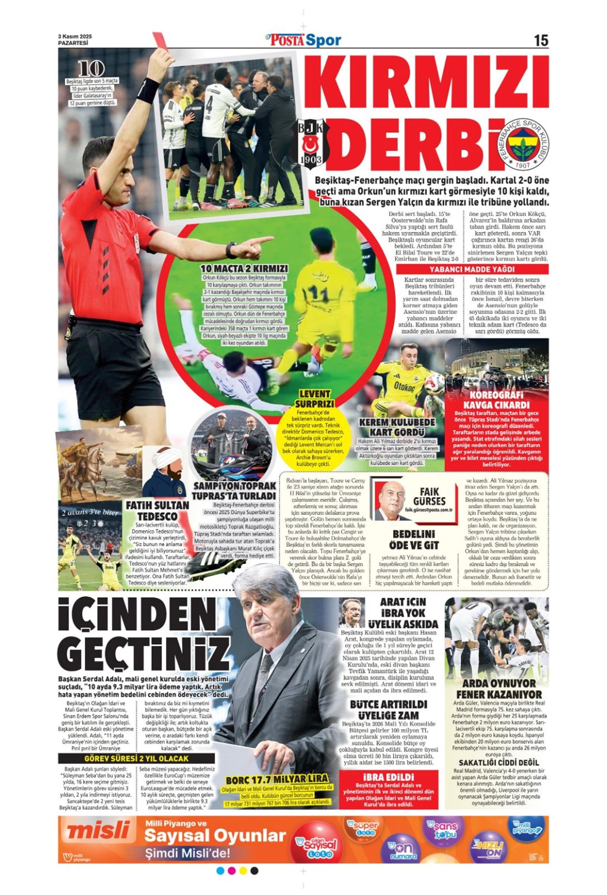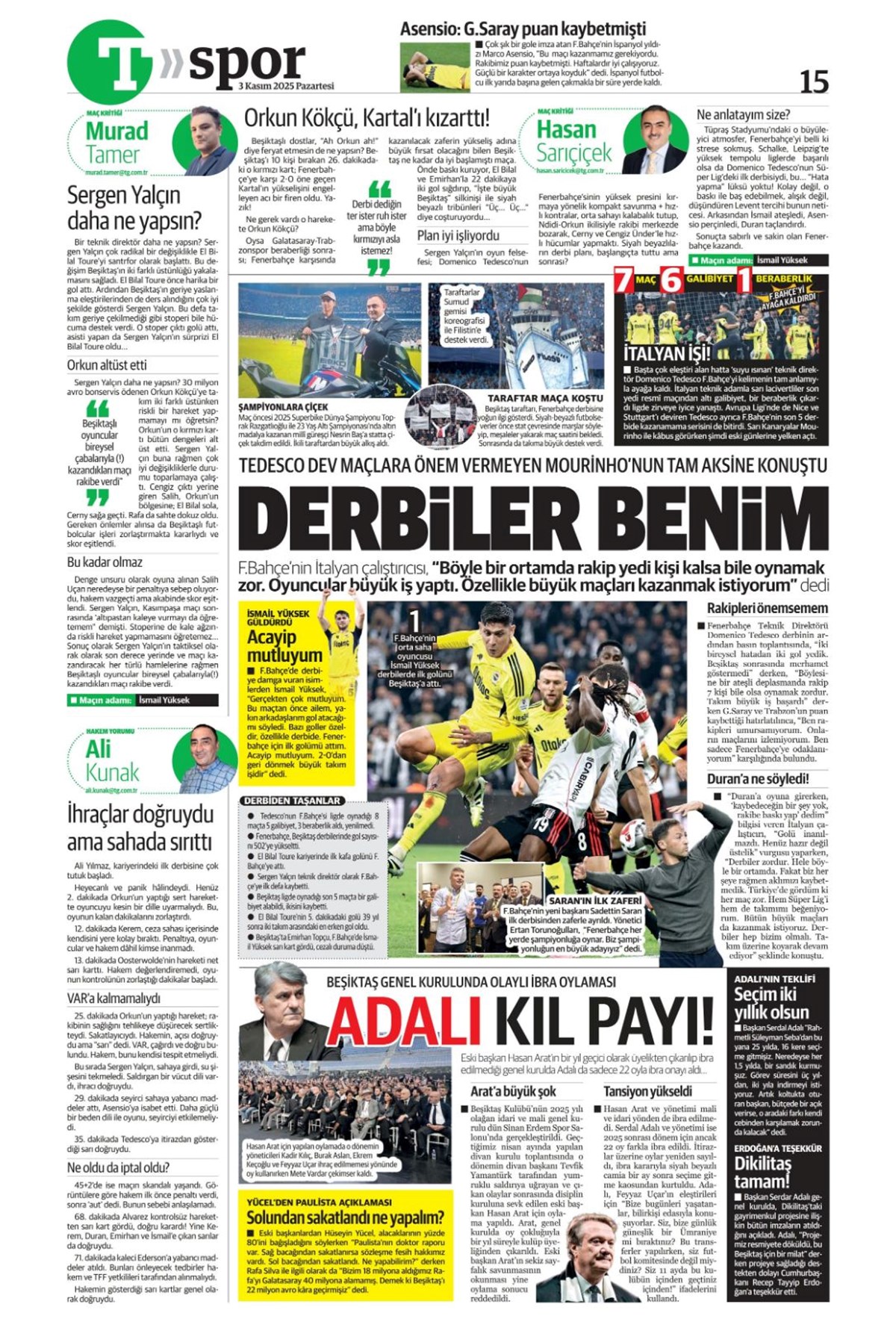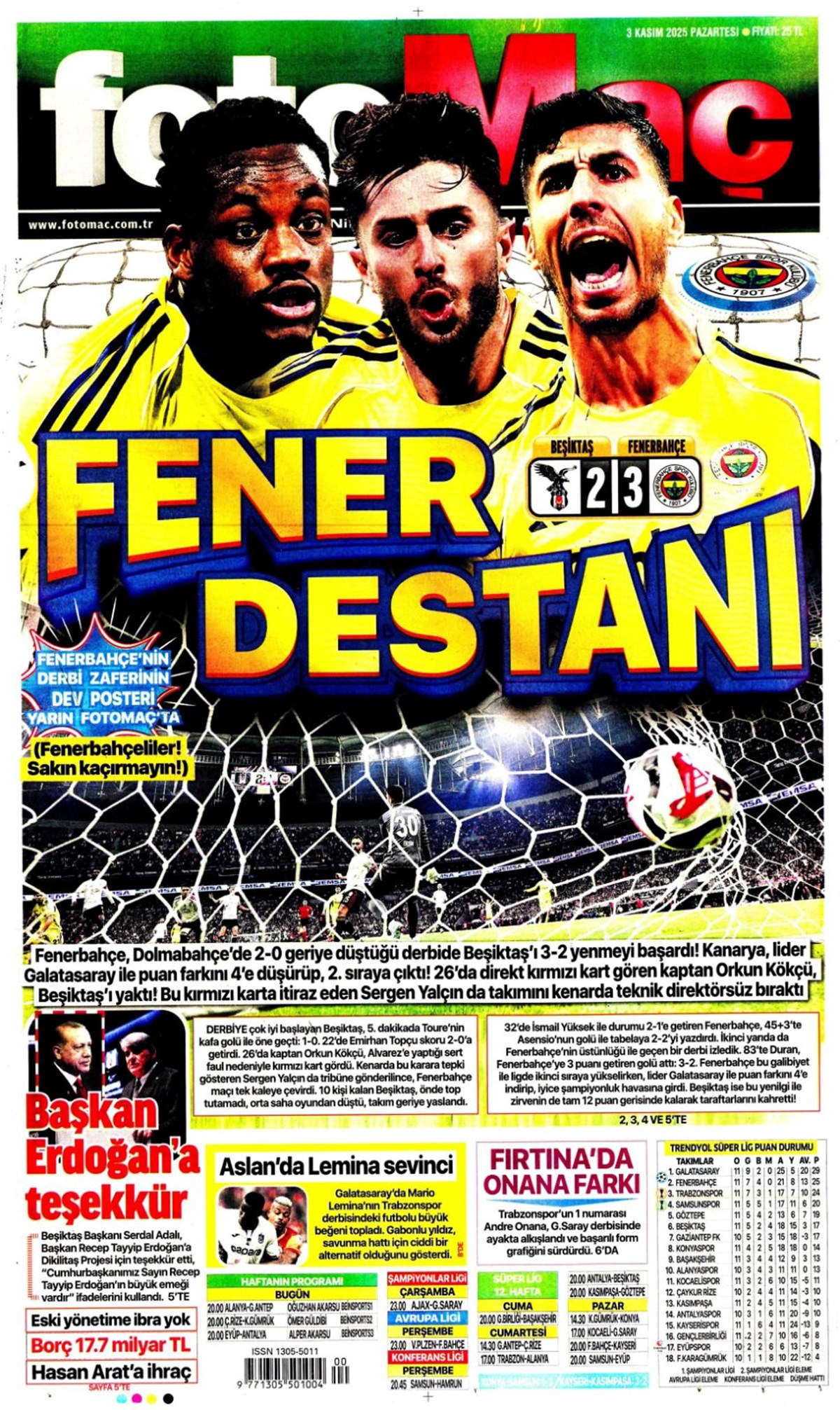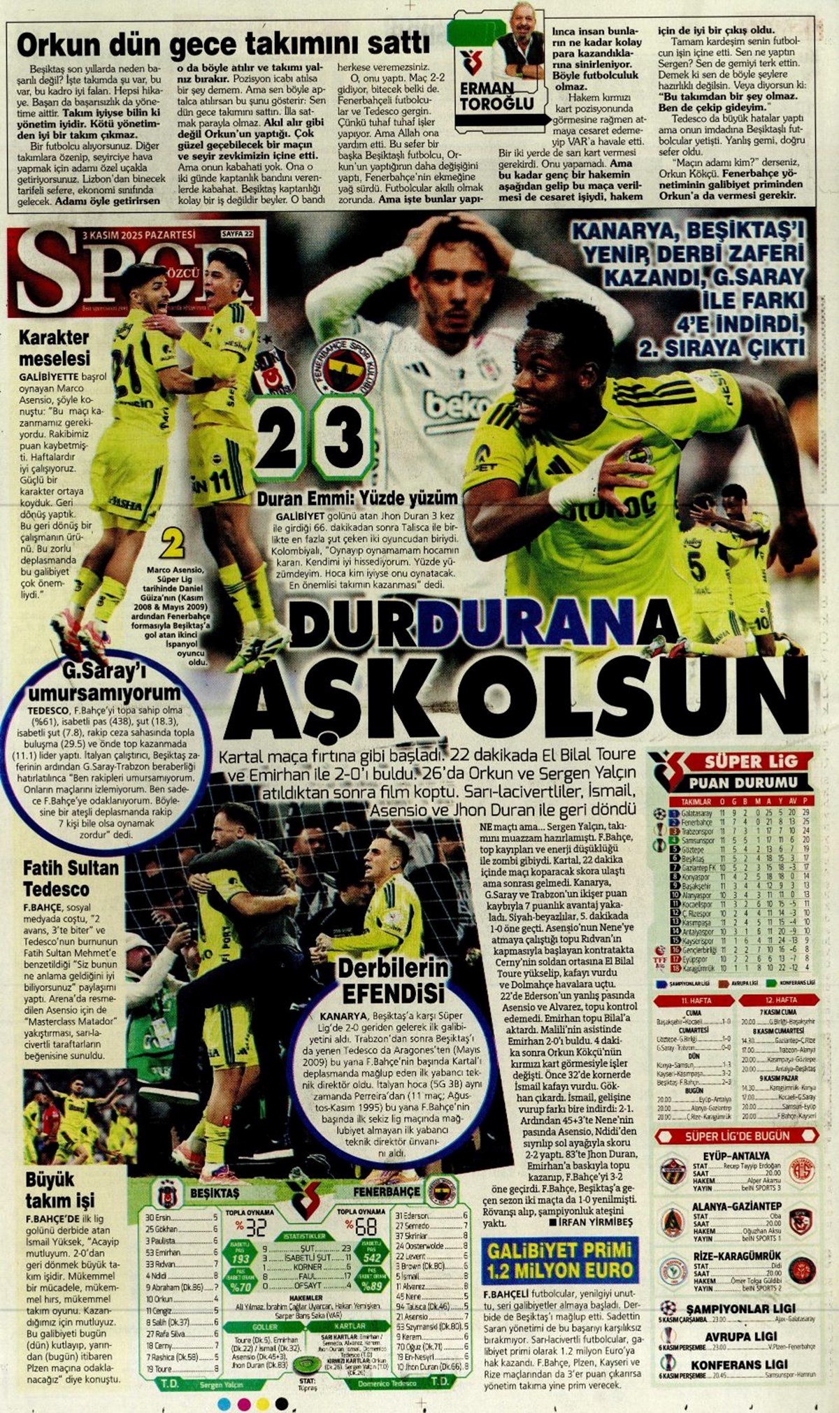 "Kırmızı derbi" (3 Kasım 2025 spor manşetleri)