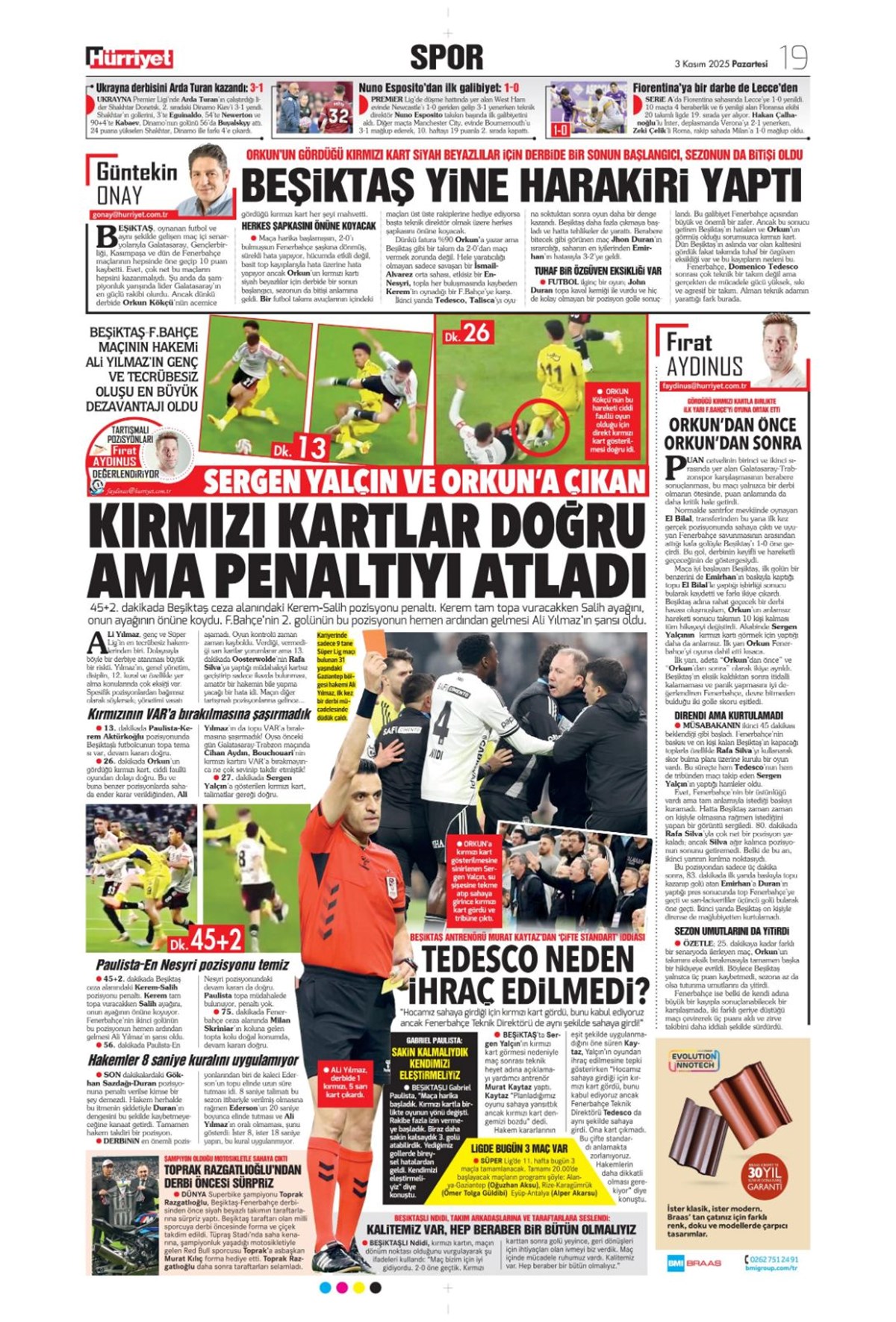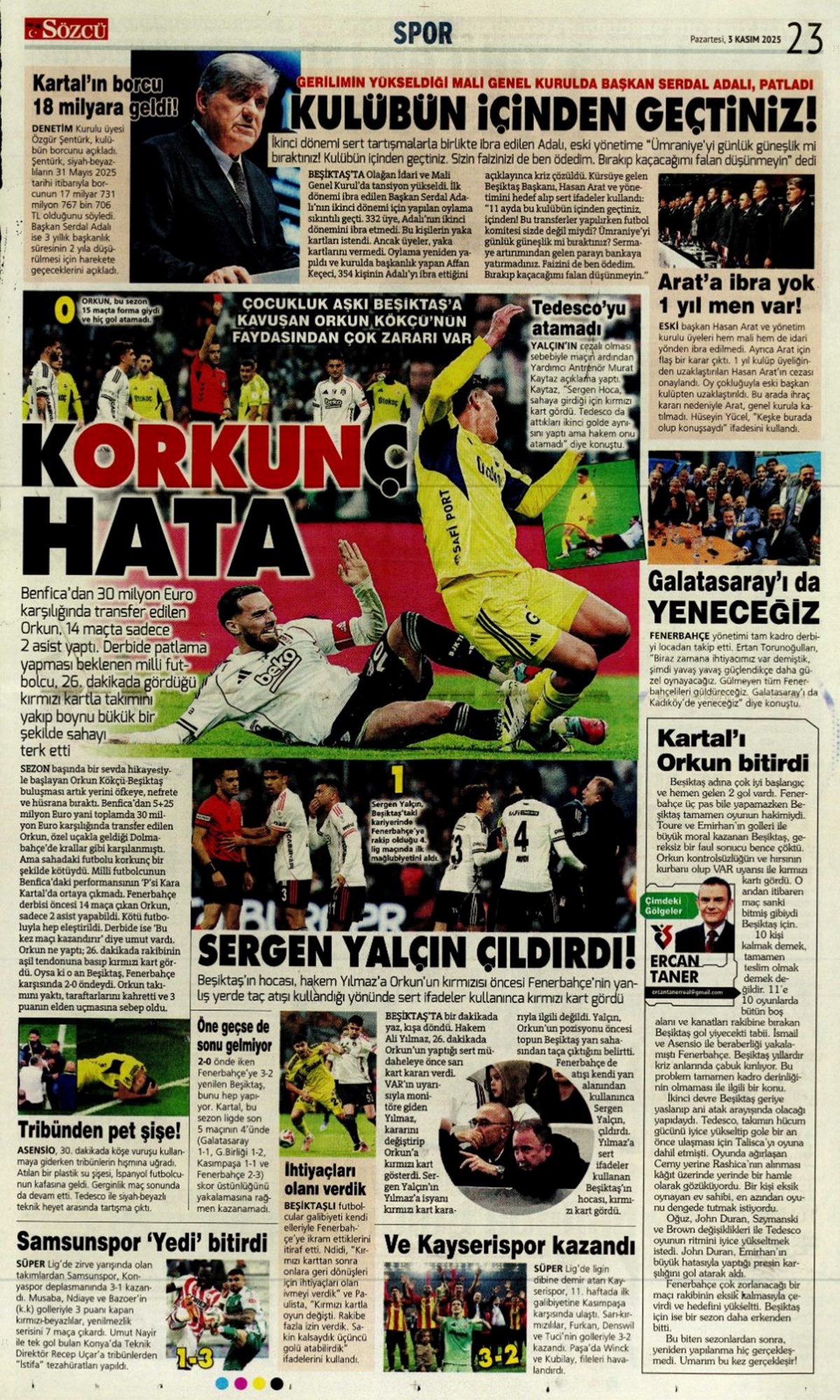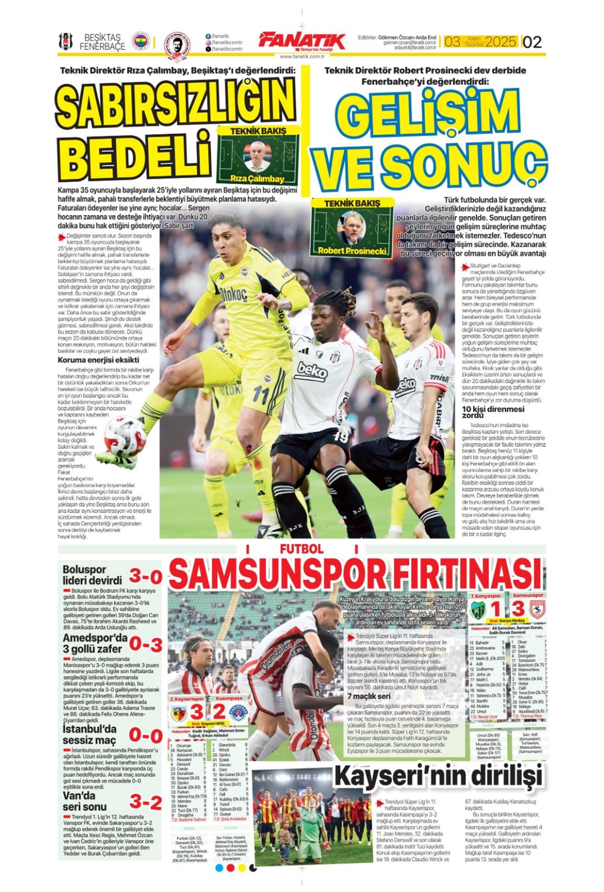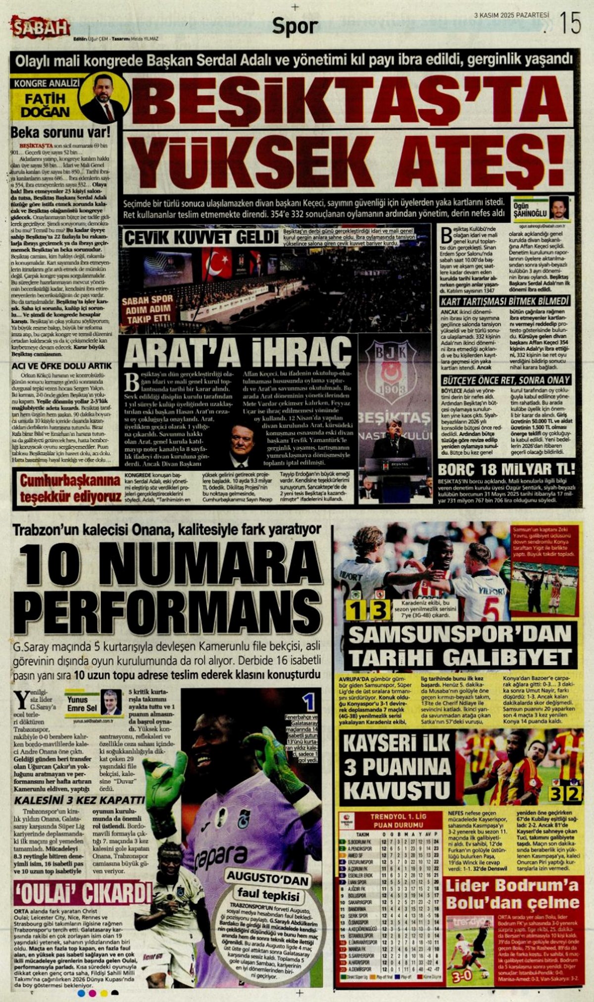 "Kırmızı derbi" (3 Kasım 2025 spor manşetleri)