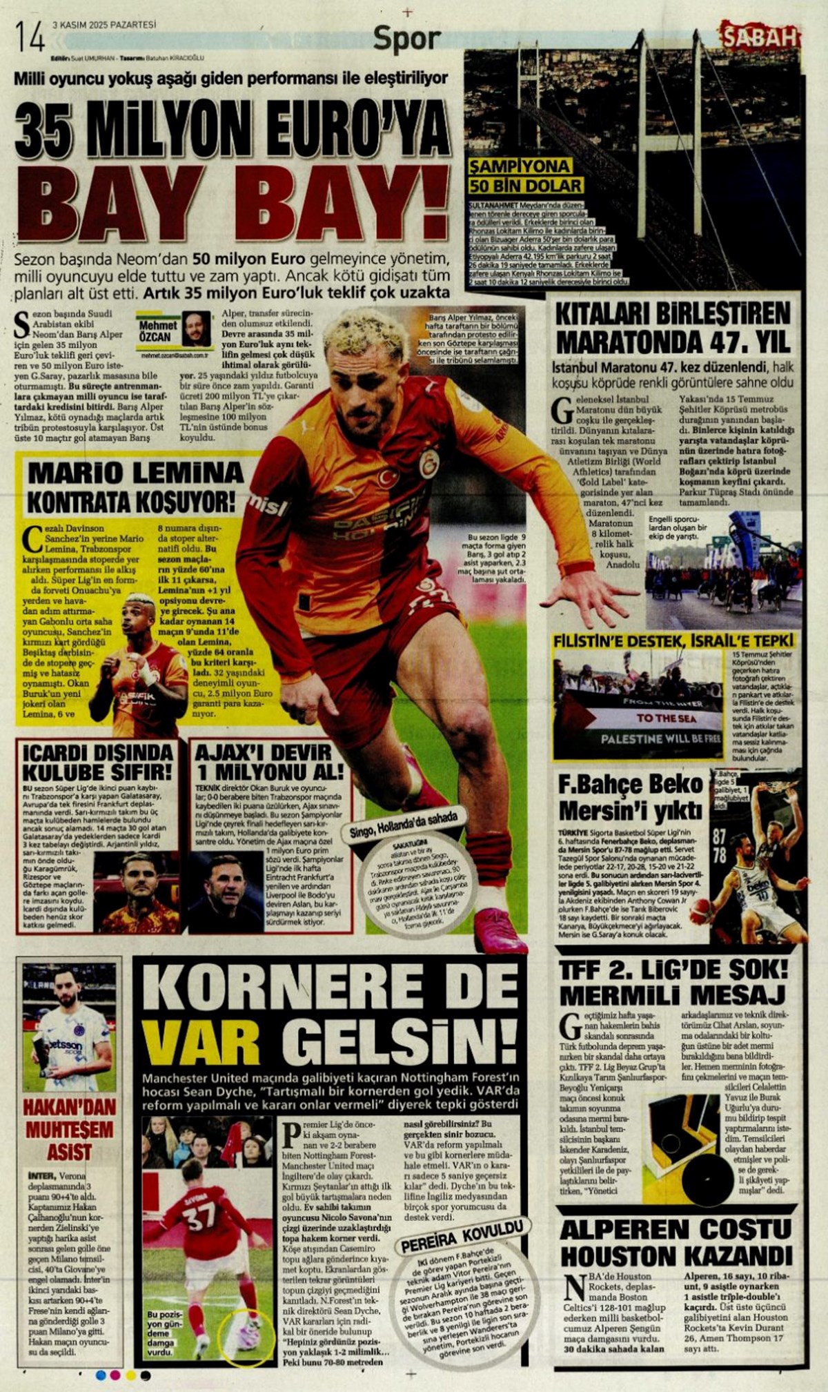 Günün spor manşetlerinde, spor gündeminden en yeni gelişmeler ve transfer haberleri yer aldı. 3 Kasım 2025 tarihli gazetelerin spor sayfalarında Beşiktaş, Fenerbahçe, Galatasaray ve Trabzonspor haberlerine, 1 dakikada göz atın.