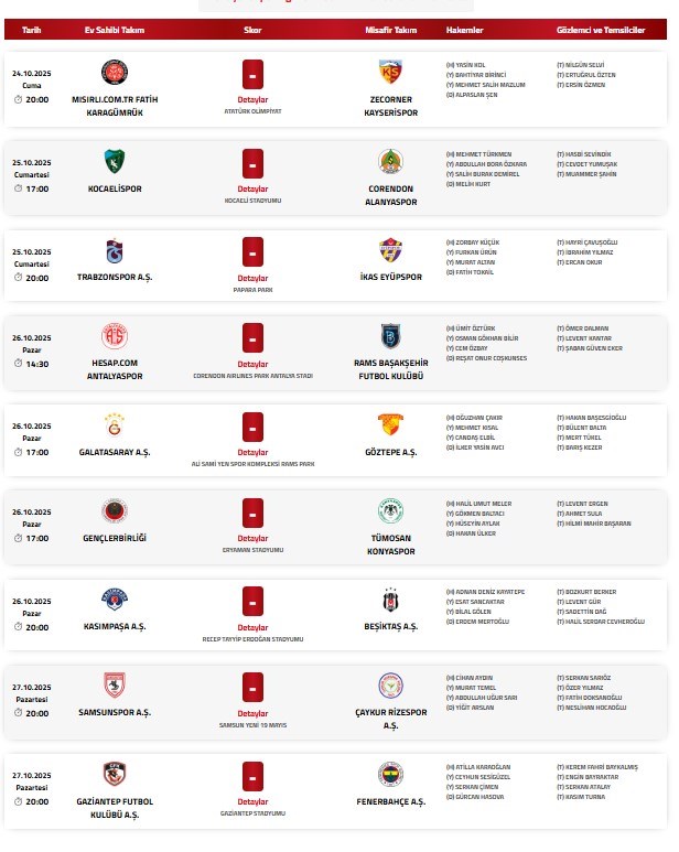 20.00 Trabzonspor - Eyüpspor: Zorbay Küçük 26 Ekim Pazar 14.30 Antalyaspor - RAMS Başakşehir: Ümit Öztürk